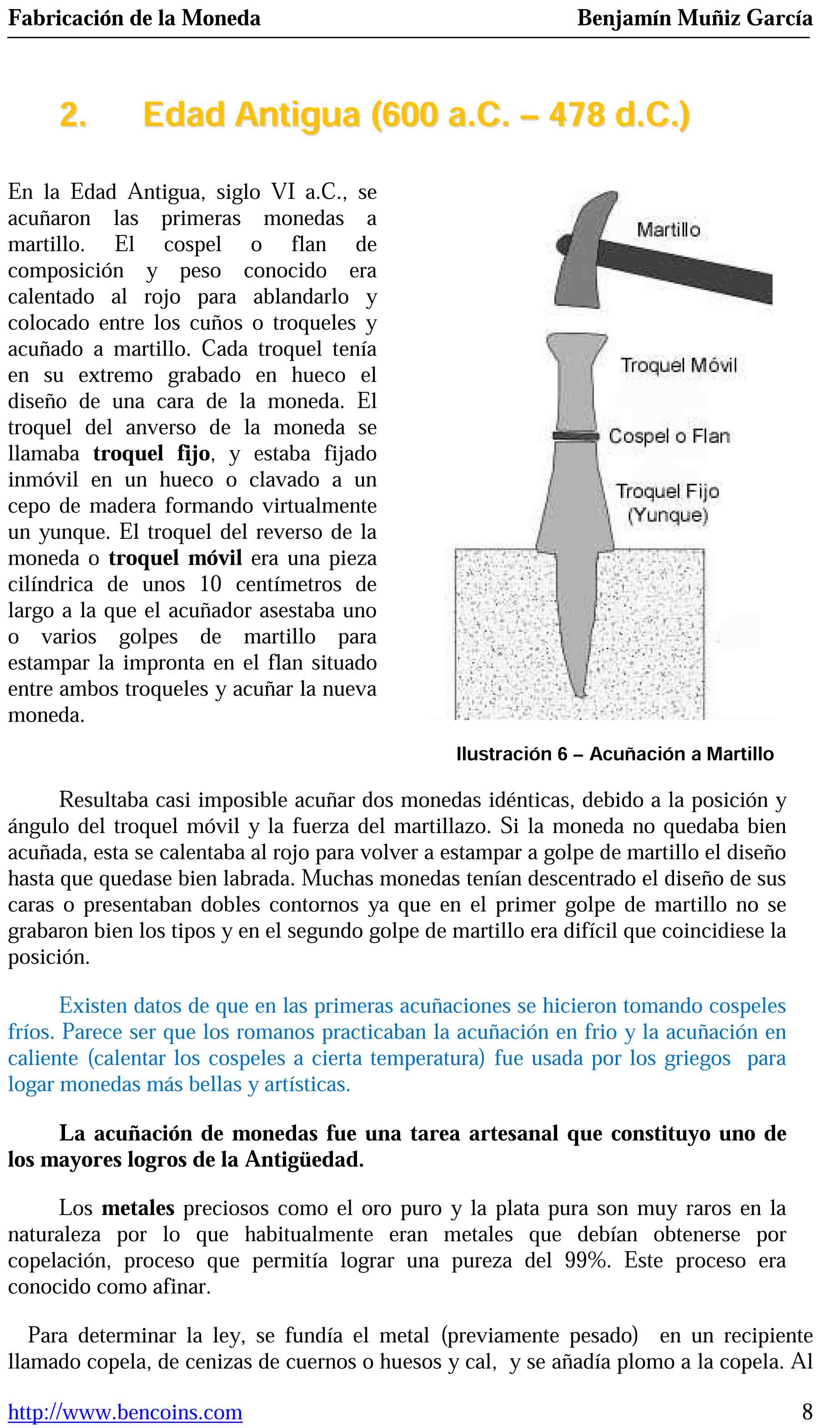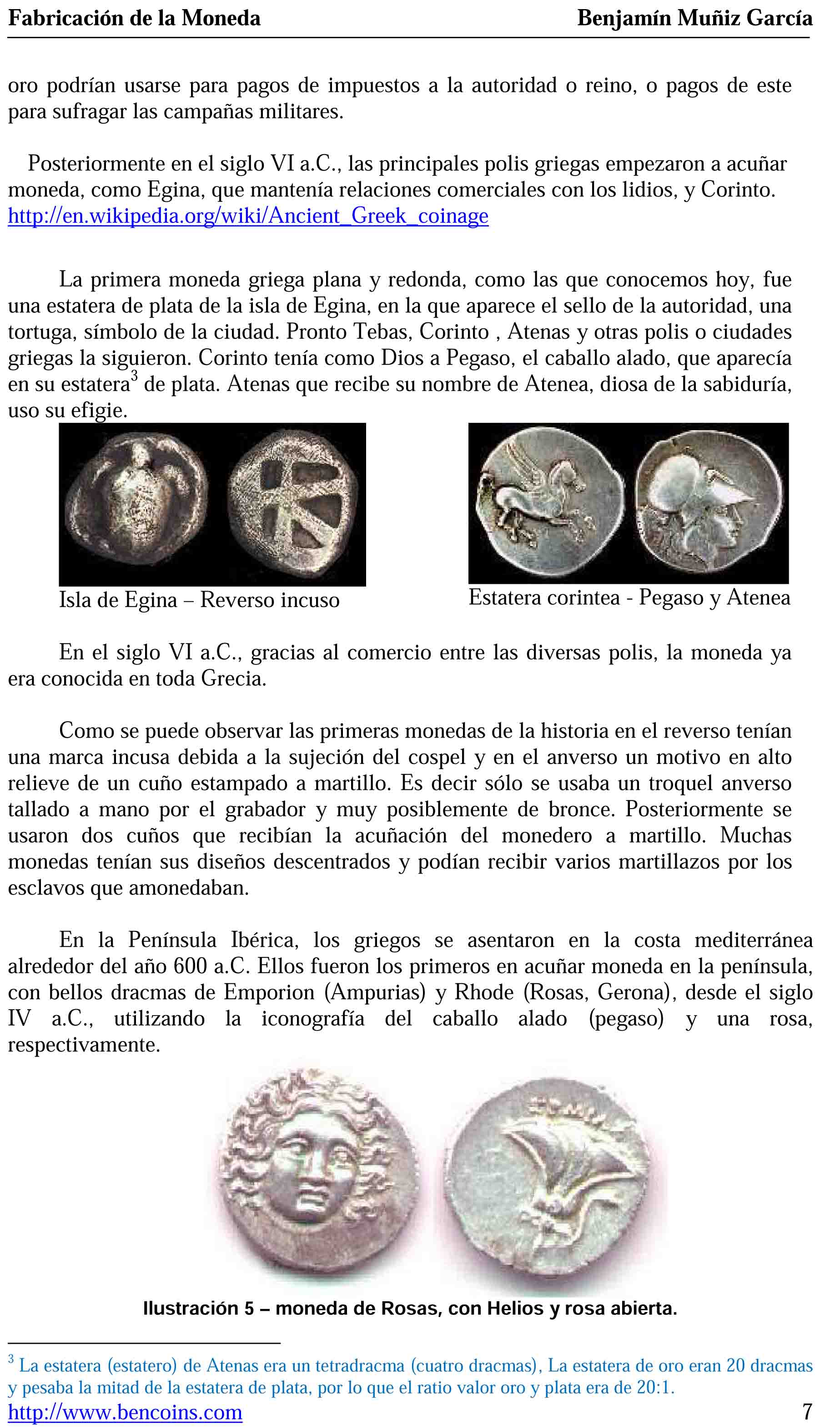 «Un siglo antes de que circulasen los primeros dracmas en la antigua Grecia, se usaba como medio de pago lingotes metálicos que se pesaban. Incluso se llegaron a marcar los lingotes con su peso y emisor que garantizaba la ley del metal. Pero faltaba una ley o gobierno emisor que garantizase la materia (pureza del metal y un peso estándar) y una forma (diseños que permitiesen su fácil identificación). Es decir los elementos que debe cumplir una moneda: ley, materia y forma.»