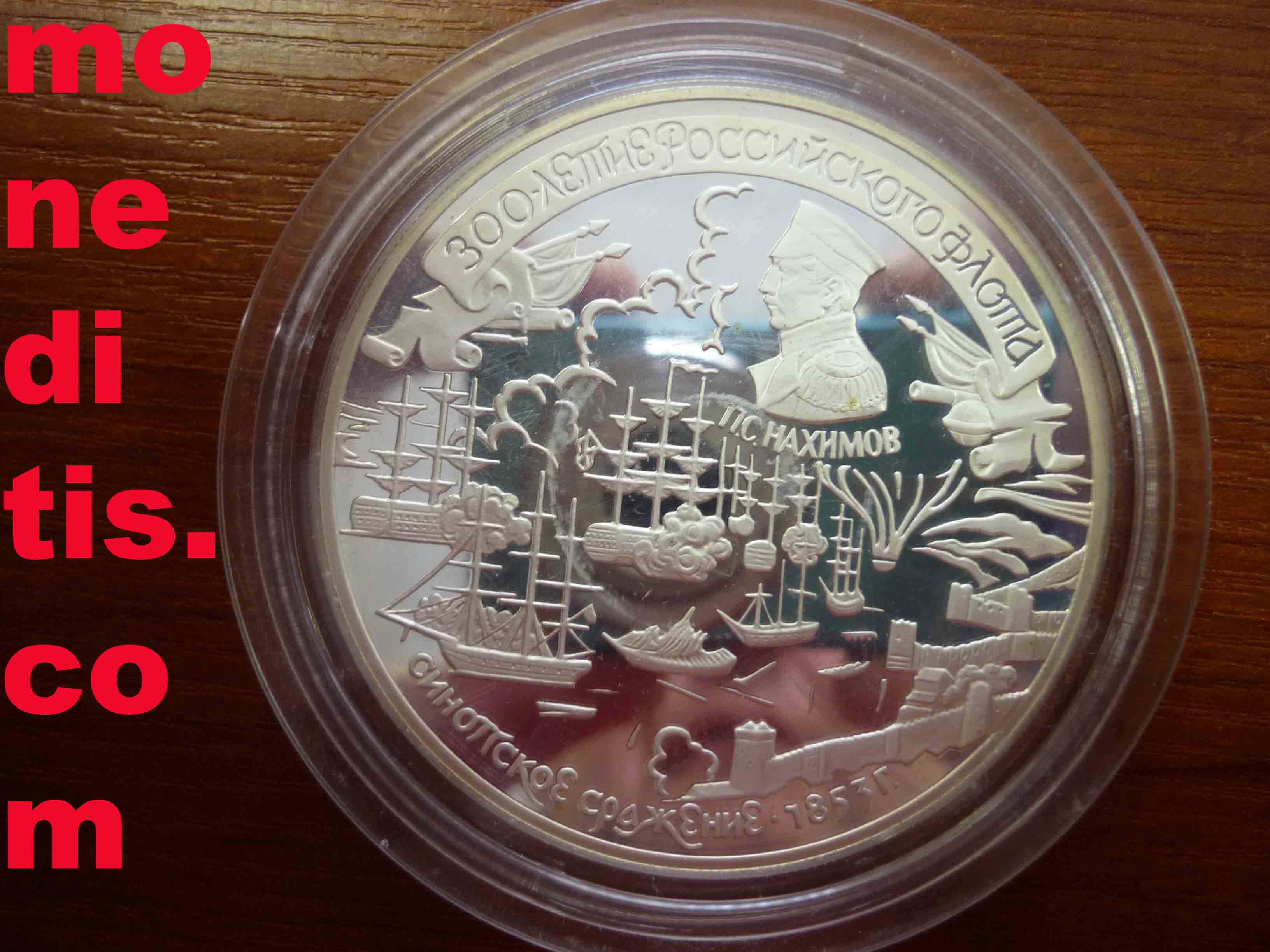 Esta moneda de 5 onzas de plata conmemora la victoria sobre los turcos en la Guerra de Crimea, concretamente en la Batalla de Sinop en 1853. Pável Stepánovich Najímov, vicealmirante al mando de un escuadrón en el Mar Negro. Fue condecorado con la Orden de San Jorge por Nicolás I. Murió en la defensa de Sebastópol en 1855