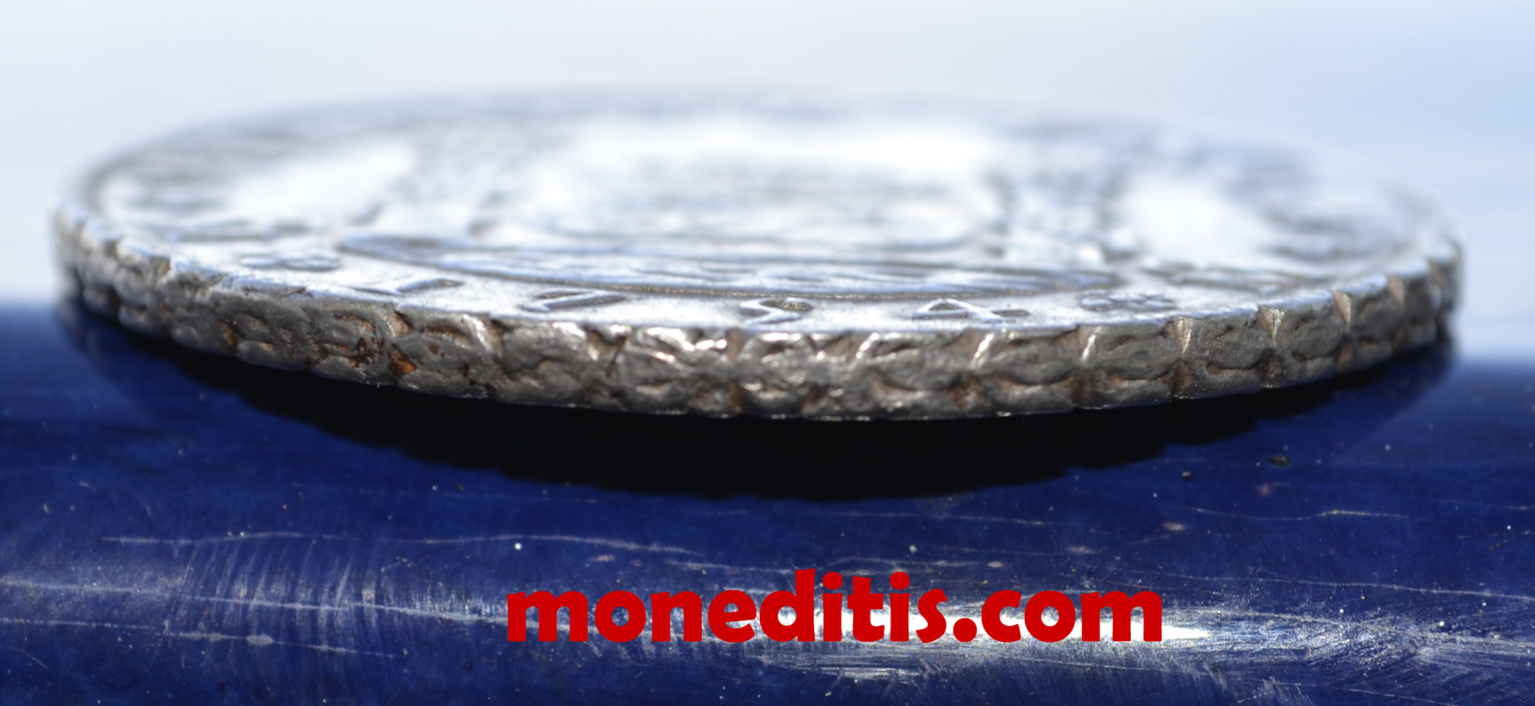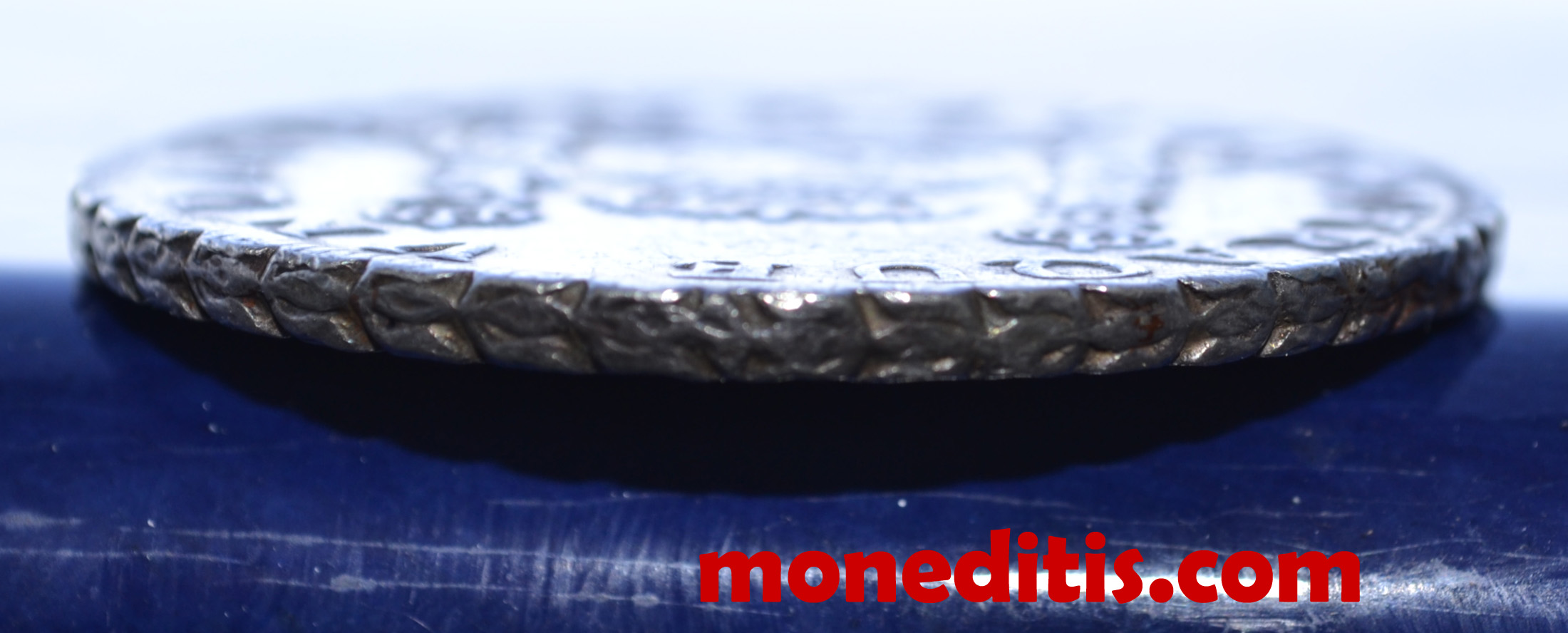 Rayitas. Buen detalle de acuñación. Limpiada hace años. Manchas. Mundos identificables; cartelas perfectamente legible PLUS VLTR. Levemente descentrada. Gráfila congruente.