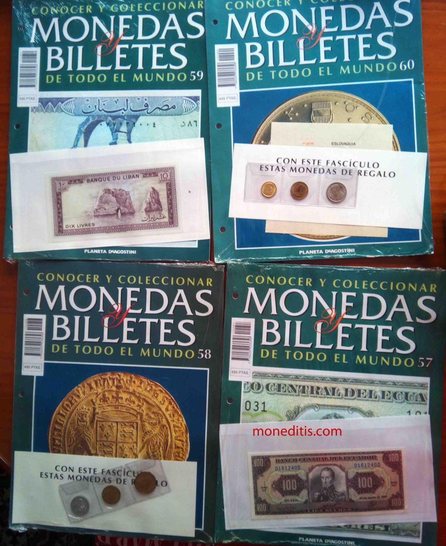 Cuatro (4) carpetas temáticas- 1 Monedas del Mundo, 2 Historia del Papel Moneda, 3 Guía del Coleccionista y 4 País Rarezas y Curiosidades- repletas de fascículos, 100 en total (más de 2 años)