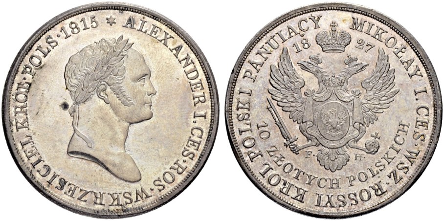 Mintage for Poland. 10 Zlotych Polskich 1827, Warsaw Mint, FH. 31.11 g. Bitkin 984 (R2). Dav. 249 (under Poland). 30 roubles according to Iljin. 8 roubles according to Petrov. Of the highest rarity in this condition. Cabinet piece with nice mint luster. Brilliant uncirculated, proof-like. Монеты для Польши. 10 злотых польских 1827, Варшавский МД, FН. 31.11 г. Биткин 984 (R2). Dav. 249 (Польша). 30 рублей по Ильину. 8 рублей по Петрову. Самая высокая степень редкости в такой сохранности. Кабинетный экземпляр с красивым штемпельным блеском. Состояние безупречно превосходное, пруф-лайк. (~€ 43860/USD 50505) To our knowledge this is the best known specimen on the market. По нашим сведениям это самый лучший из известных на рынке экземпляров. Starting Price: 50’000 CHF