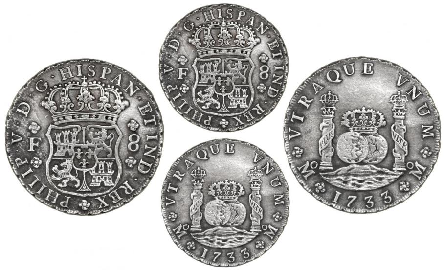 Mexico City, Mexico, pillar 8 reales, Philip V, 1733F, ex-Coffins Patch. KM-103; CT-775. 26.42 grams. Really beautiful for a shipwreck coin, with bold full AU details enhanced by contrasting toning on fields and the barest trace of surface corrosion all over, great combination of attractive design and strike and preservation. From the «Coffins Patch» site, with certificate from the salvager, pedigreed to our Auction #6, with original lot-tag #492. Recovered from: Spanish 1733 Fleet, Florida Keys