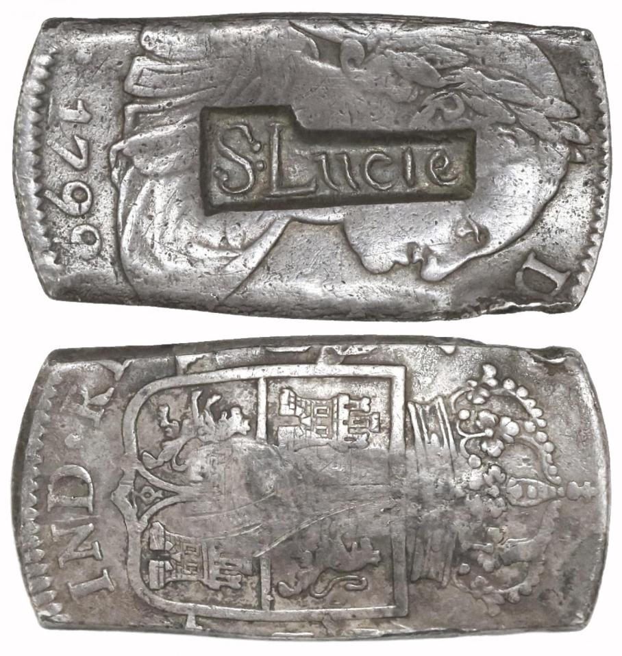 Potosi, Bolivia, cob 8 reales, 1650O, with THREE crowned countermarks (two T’s on shield, one script-P on cross), extremely rare. S-P35; KM-19b; CT-509. 18.49 grams. Two impressively clear T countermarks (one 100% full) on a well-detailed shield with full P-O and 😯 to sides, also full but doubled date on other side (variety with dots between digits) that features a nearly full script-P countermark, the whole coin thin from corrosion and with edge-split but nicely toned. Recovered from: Capitana, sunk in 1654 off Chanduy, Ecuador