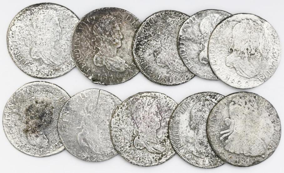 Lot of ten Spanish colonial bust 8 reales, various mints and periods. 204.53 grams total. Nice mix of dates and mints including a Santiago, Chile, 1816FJ and two Durango-minted War for Independence issues. All corroded and polished but with visible dates and mintmarks, some with assayers visible. With generic certificates from the salvagers. Recovered from: Sabina, sunk in 1842 off South Africa