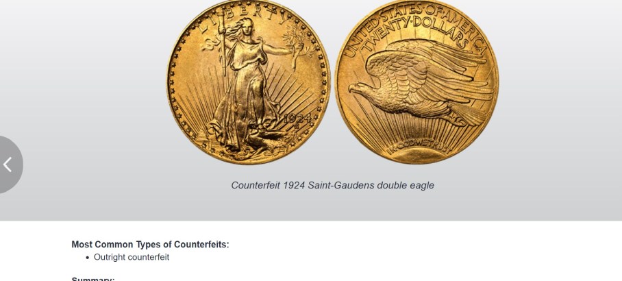 Además de los Gold Indian Quarter Eagles y Gold Dollars, los 20 $ Gold Double Eagles Saint-Gaudens de 1924, aún siendo de oro .900, se han falsificado bastante, dentro de la categoría de monedas americanas más falsificadas
