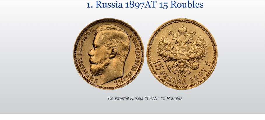 En cuanto a las 25 monedas mundiales más falsificadas, el top 1 lo ostentan los 15 rublos oro 1897 Nicolás II