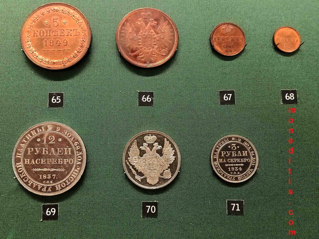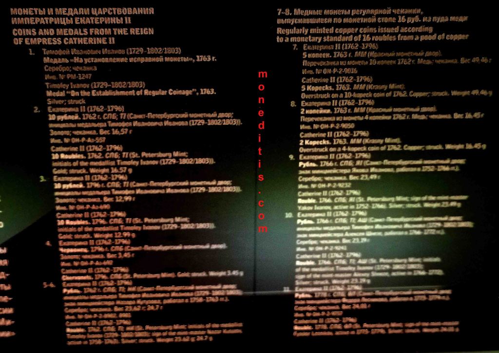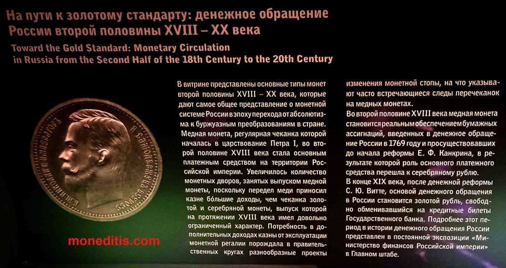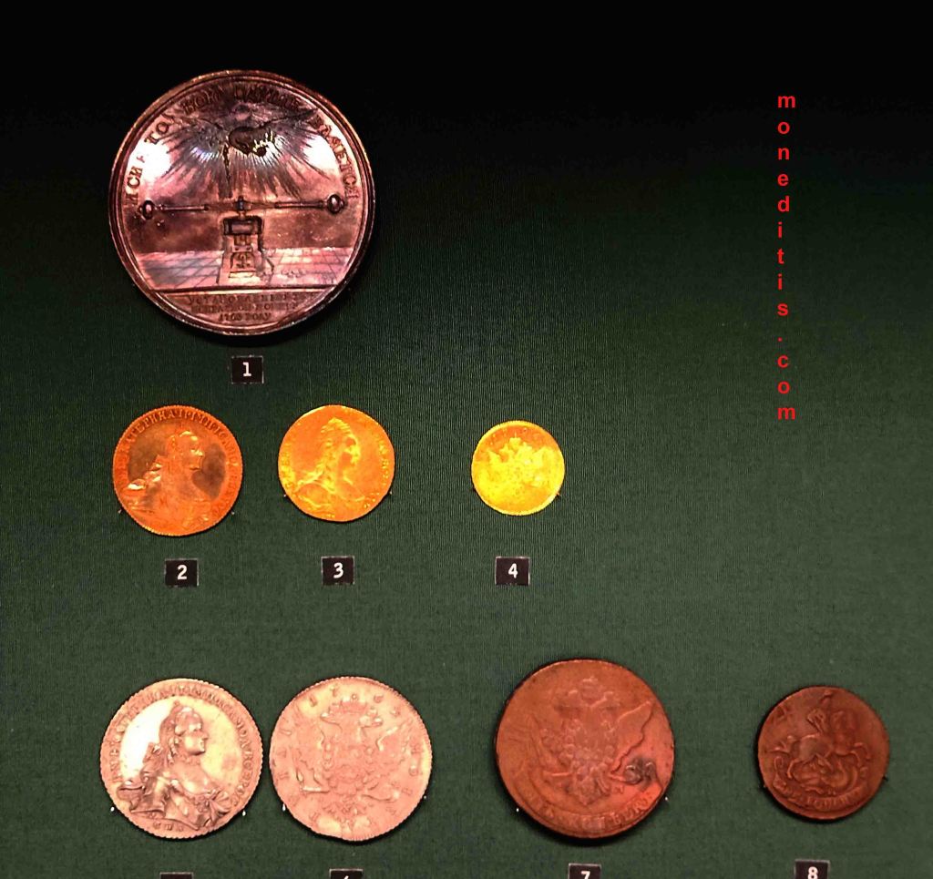 El escaparate presenta los principales tipos de monedas de la segunda mitad del siglo XVIII – XX, que dan una visión general del sistema Monetario Ruso en la época de transición del absolutismo a las transformaciones burguesas del país. La moneda de cobre, cuya acuñación regular comenzó en el reinado de Pedro I, en la segunda mitad del siglo XVIII se convirtió en el principal medio de pago en el territorio del Imperio Ruso. El número de casas de moneda dedicadas a la emisión de monedas de cobre aumentó, ya que la acuñación de cobre trajo unos mayores ingresos para las arcas del Imperio que la acuñación de monedas de oro y plata, cuya emisión a lo largo del siglo XVIII fue bastante limitada. Dada la necesidad de tener ingresos adicionales por parte del tesoro público en la acuñación de moneda, hubo una gran variedad de proyectos de cambio de conversión monetaria, como lo indican los rastros de resellos que se encuentran a menudo en las monedas de cobre.