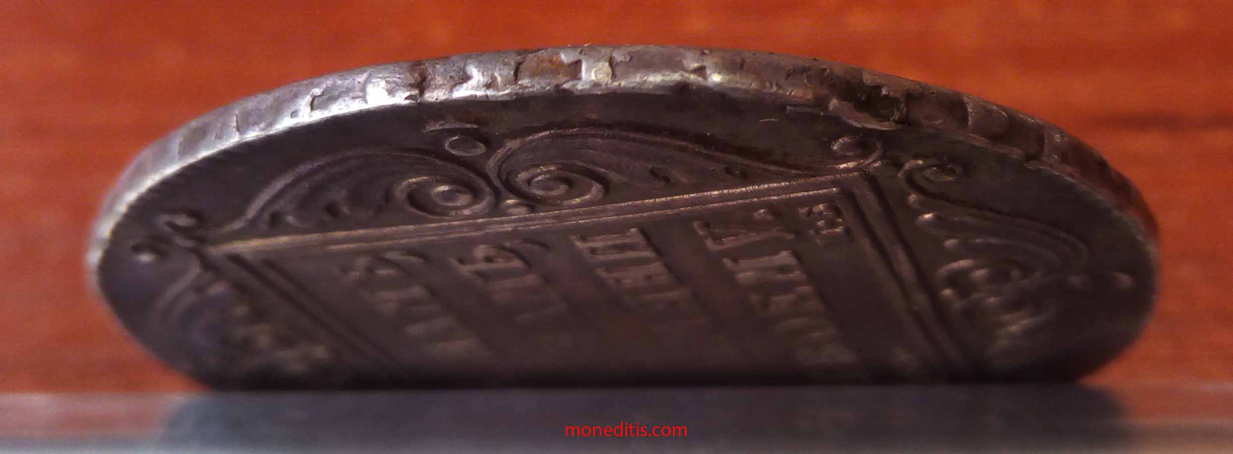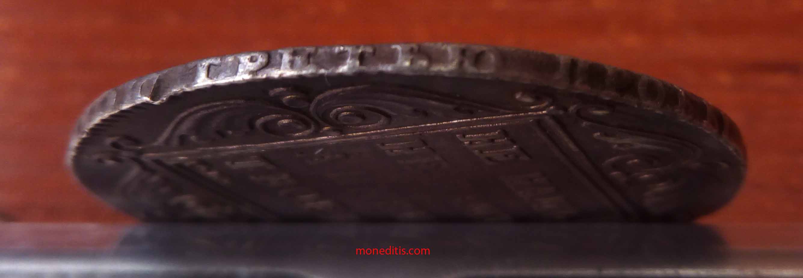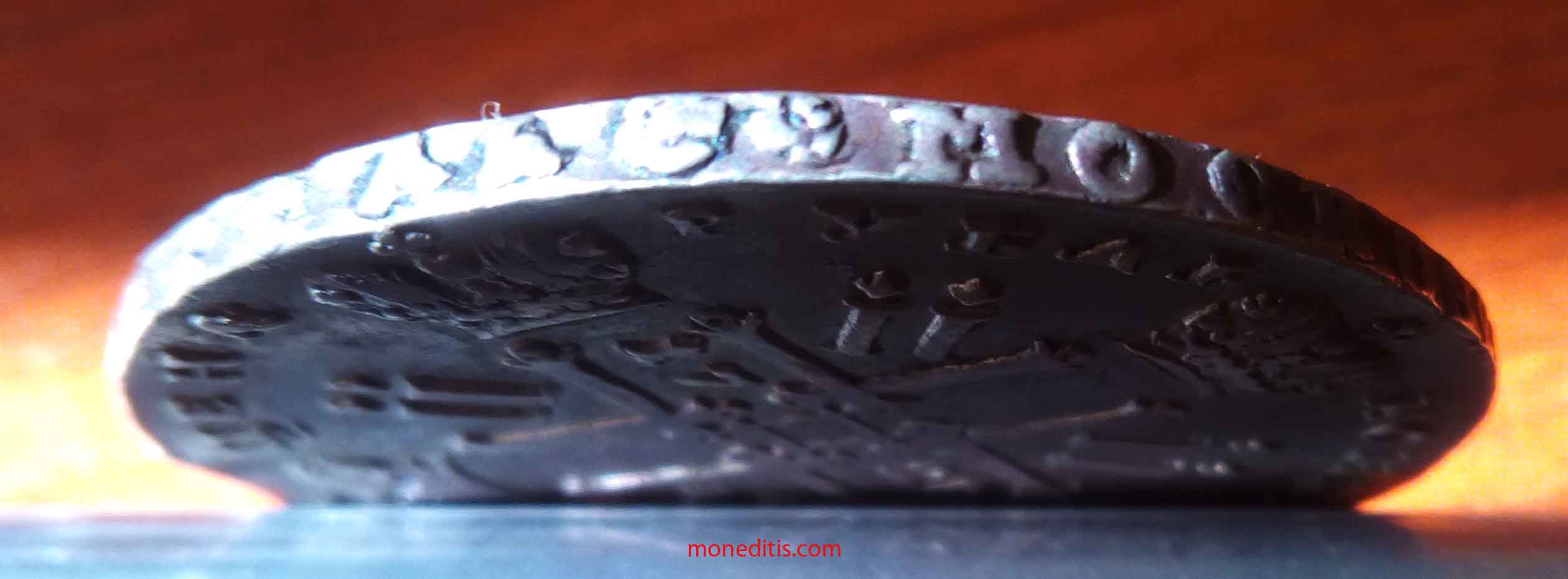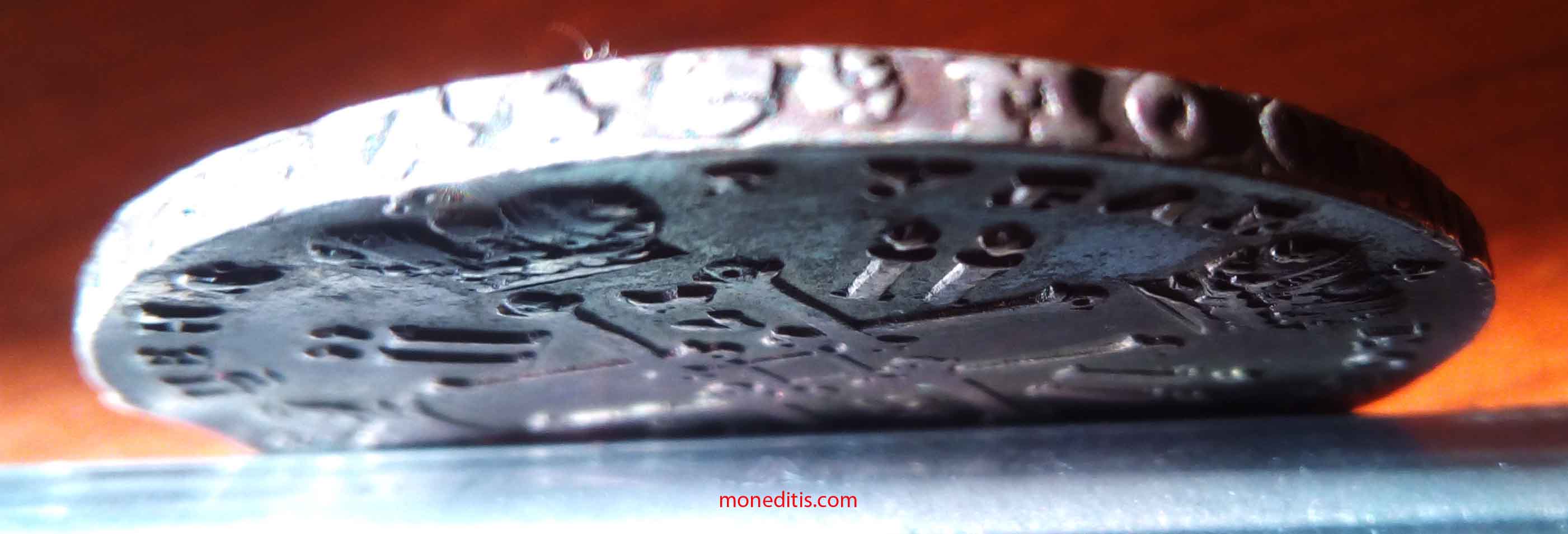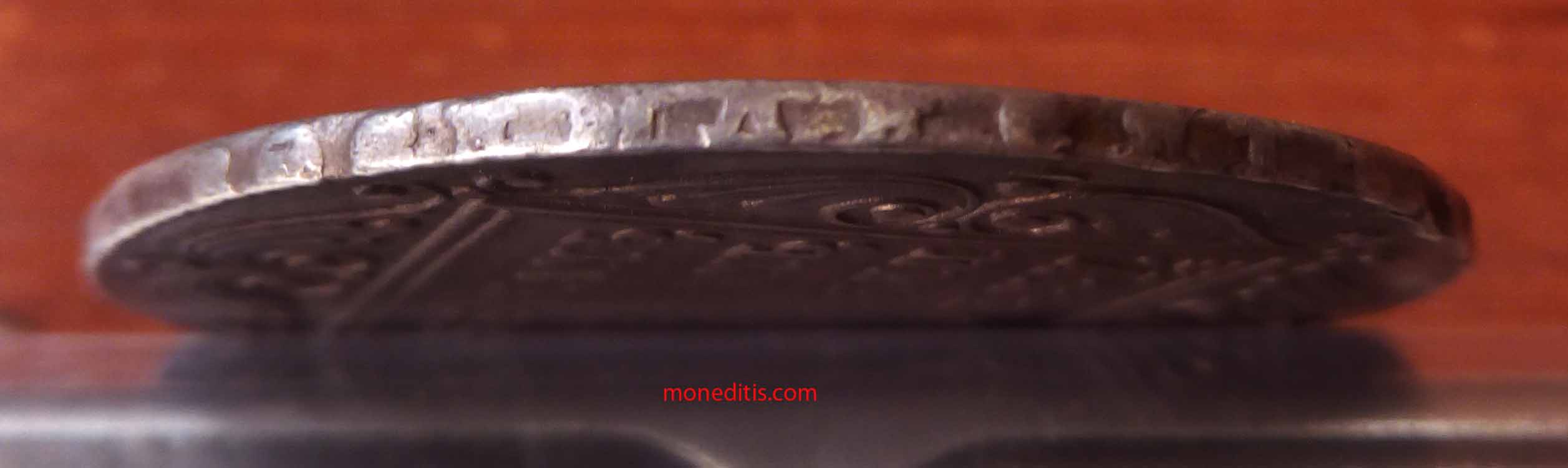 Sin tener mucho en cuenta la calidad de la foto del reverso, empezamos a vislumbrar algún que otro detalle en leyendas y acuñación central floja (habitual) pero descuidada…todo lo anterior añadido al desgaste desigual del busto armado, escudo… con diversas imperfecciones de gráfila