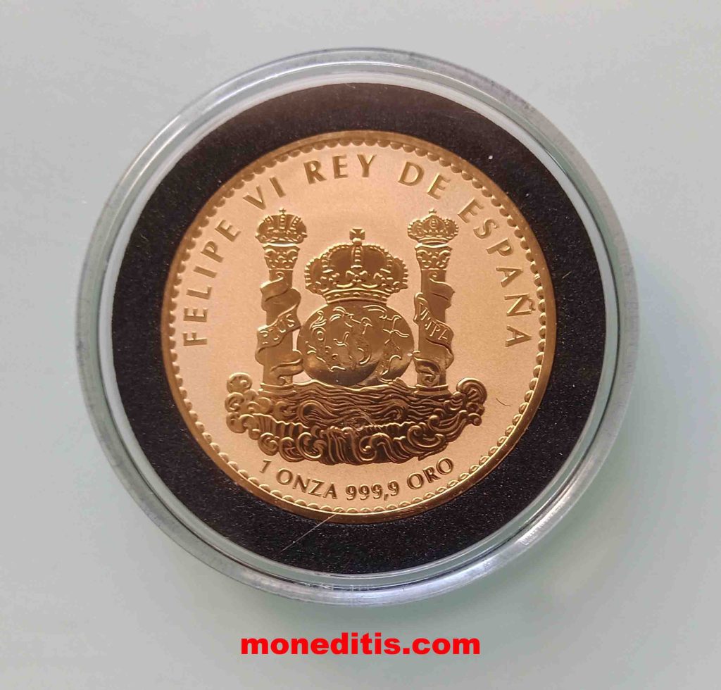 ¡El símbolo de mis amados columnarios en una moneda de oro! ¡Mundos y mares con sus columnas y coronas imperial y real! Nótese la ley del metal: 999,9