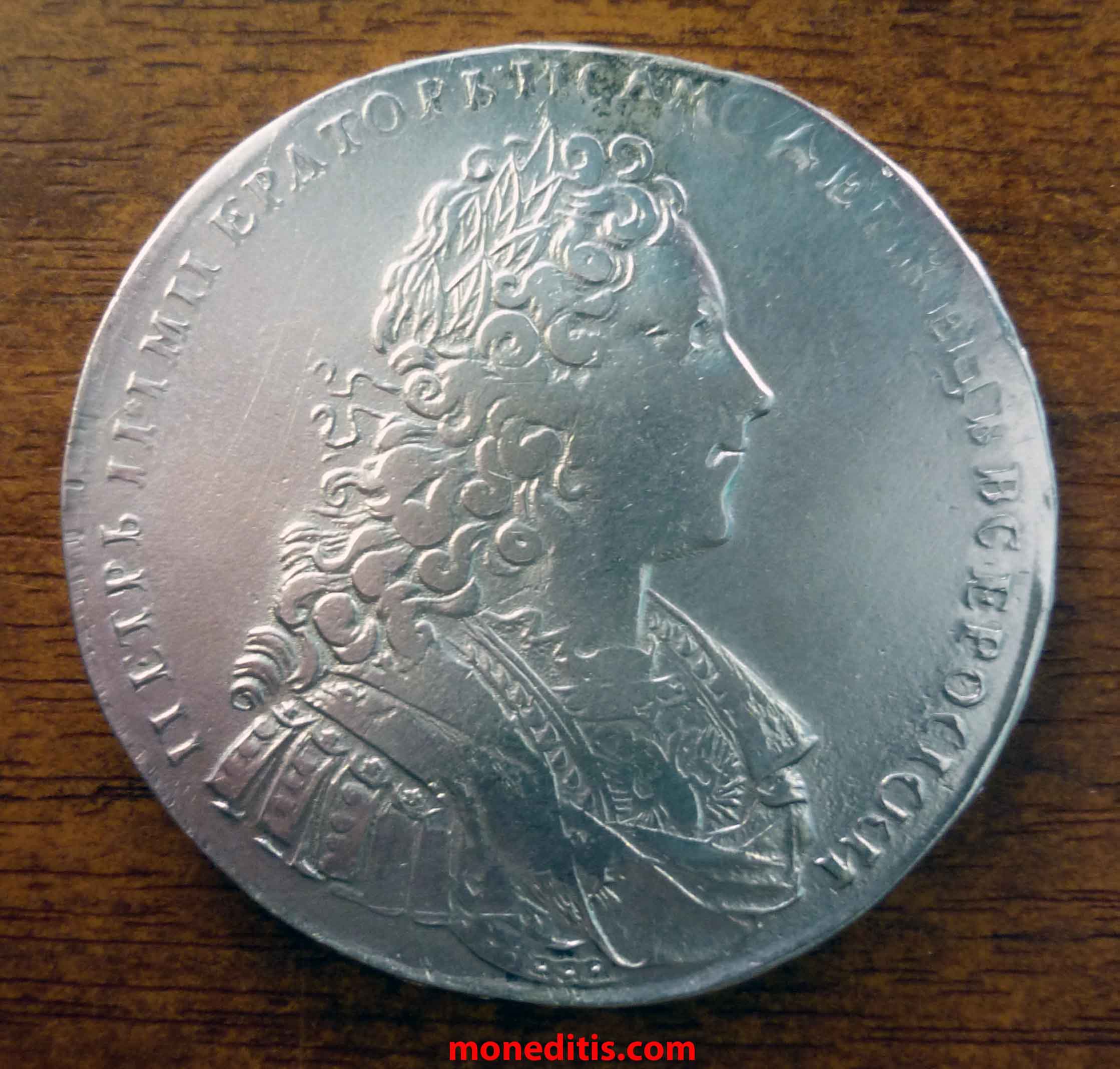 Canto – «Rublo ruso de la corte de Moscú». La leyenda del anverso es «Pedro II emperador y Autócrata de todos los rusos», el Reverso es» Moneda nuevo precio Rublo » y la fecha en números arábigos. Prueba-729, peso estándar — 28,44 gramos. Medallista / Grabador-Anton Schulz
