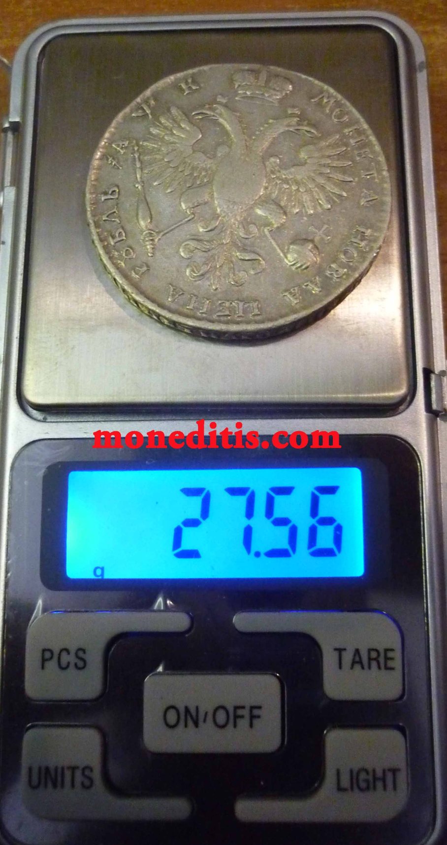 Reverso: «МАНЕТА.НОВАЯ.ЦЕНА.РУБЛЬ» (Монета новая, цена – рубль) и буквенное обозначение года чеканки «҂АΨК» (1720).