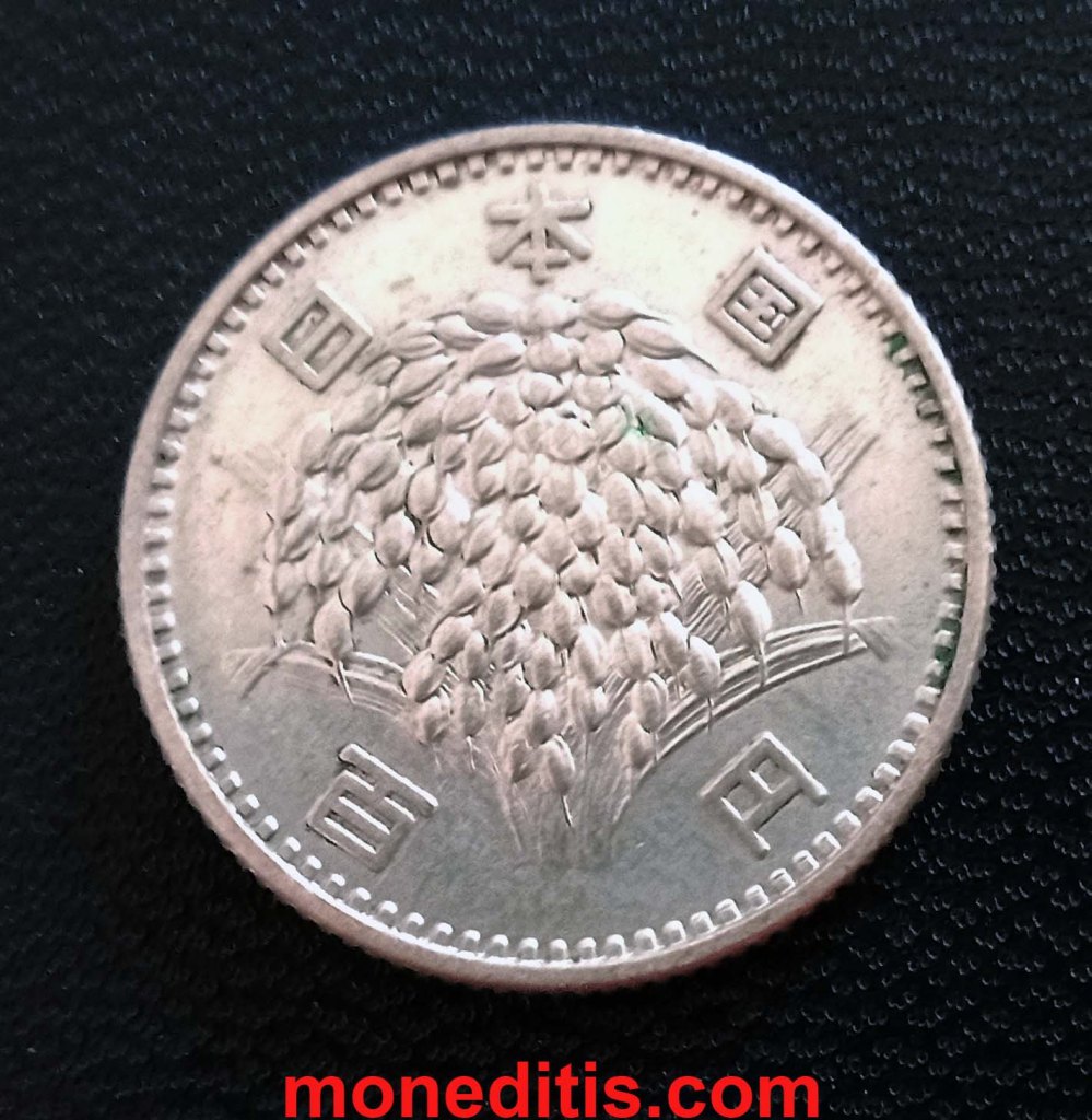 En el anverso aparece arroz que, probablemente, pudiese ser comprado con esa moneda en 1966 (valor facial de 100 ¥ superior al valor de la plata contenida en la moneda en la época) pero hoy, seguro que no con ese facial, pero quizá si por su contenido en plata…sin analizar si la moneda tiene algún valor numismático añadido. Un cuenco de arroz es un cuenco de arroz.