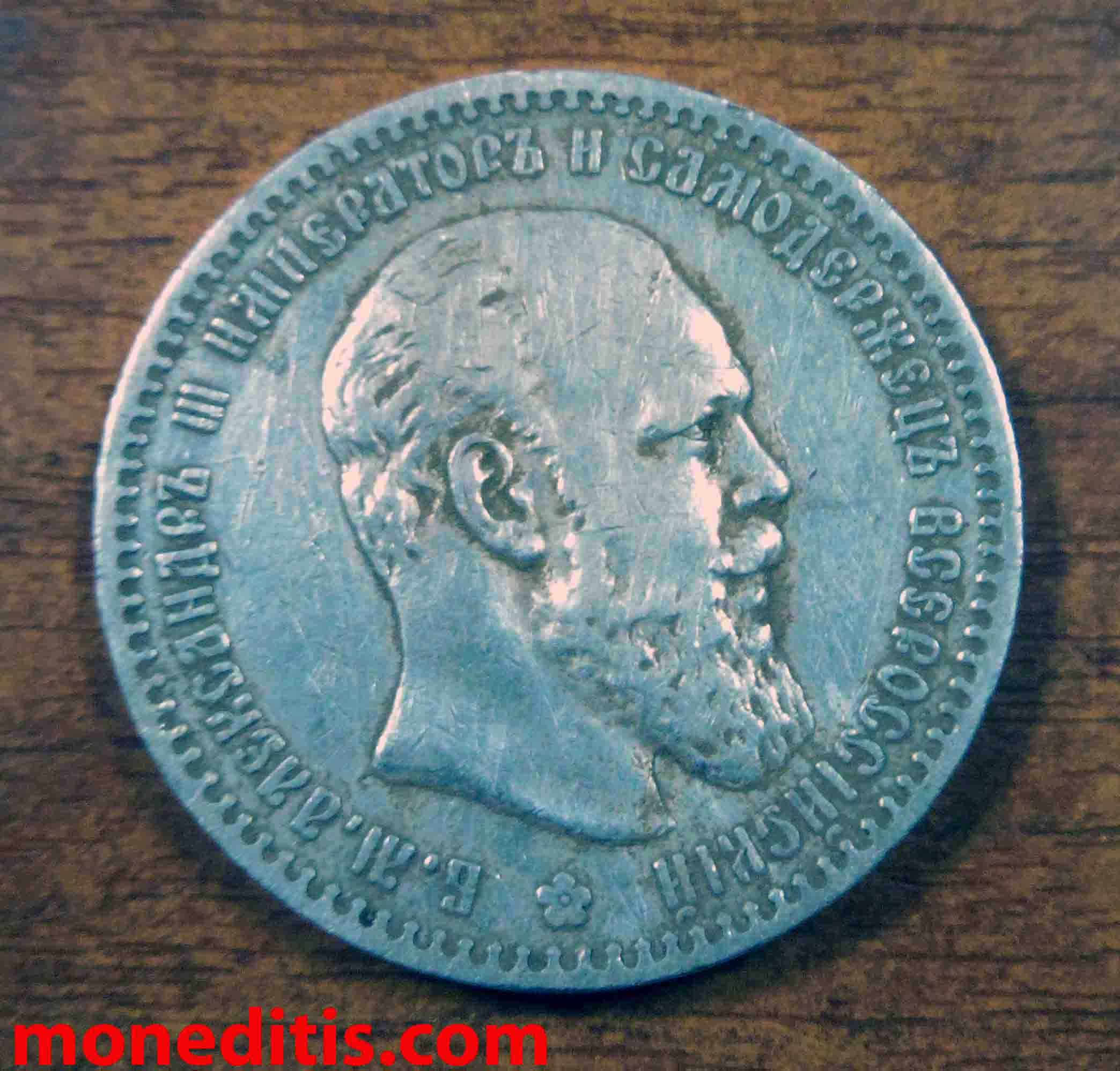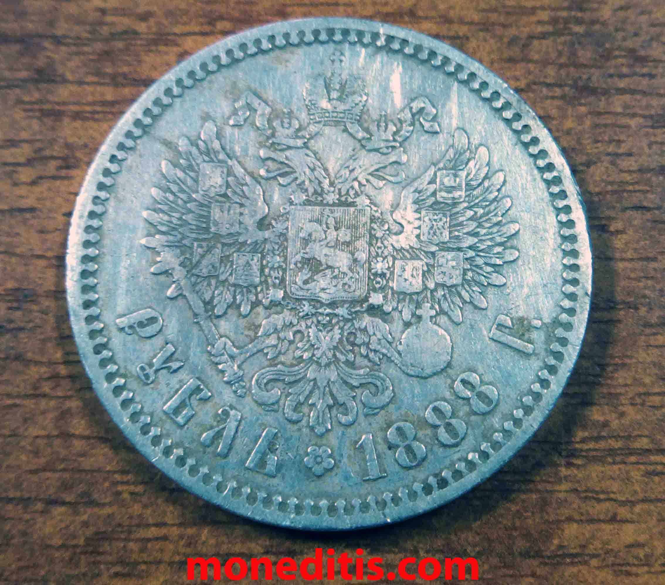 Este rublo de 1888 tuvo una tirada de 498.017 unidades y fue acuñado en la ceca de San Petersburgo СПБ . La barba no toca la leyenda y la cabeza del zar es pequeña