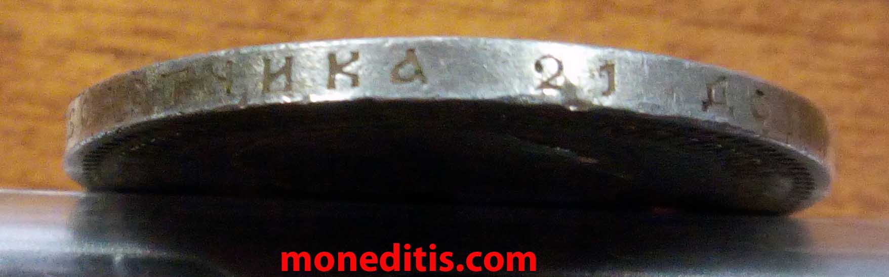 Проба — 900, нормативный вес — 20,0 грамма. Гуртовая надпись – «чистаго серебра 4 золотника 21 доля».
