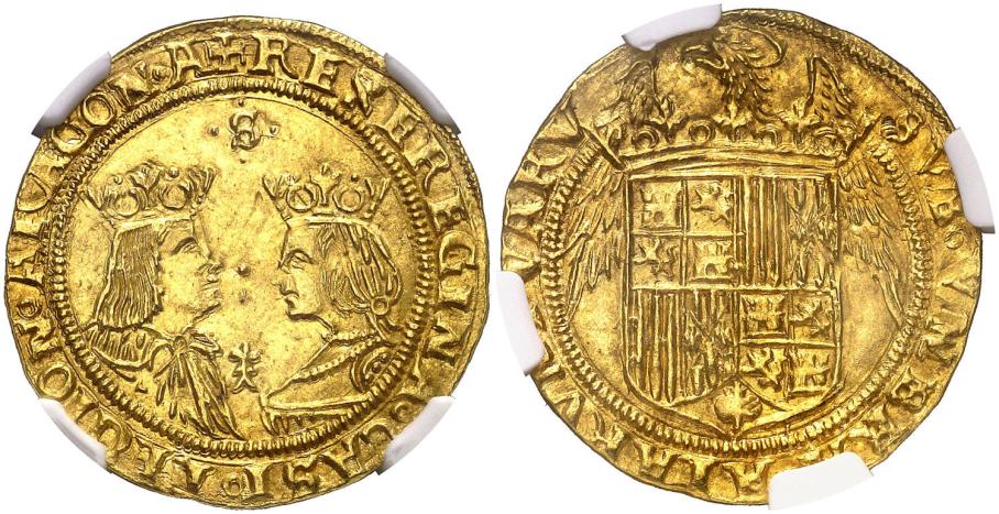 Lot 307 * Reyes Católicos. Sevilla. Doble excelente. (Cal. 82). 7,13 g. , punto y armiño entre los bustos. En cápsula de la NGC como MS65, nº 2727476-010. Ex Maison Palombo 21-22/10/2017, nº 457. Rarísima sin el nombre de los reyes y más en esta excepcional conservación. S/C-.                                                                                                                          Estimate: 15000 EUR  Starting Price: 12 000 EUR  Price realized: 12 600 EUR