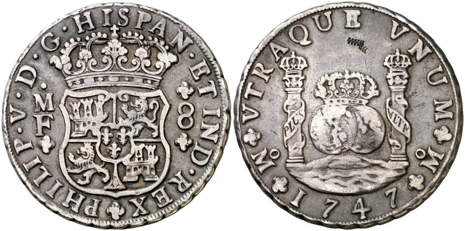Lot 428  1747. Felipe V. México. MF. 8 reales. (Cal. 501). 26,69 g. Columnario. Raspadura. Rara. MBC-. Estimate: 450 EUR  Starting Price: 350 EUR  Lot unsold