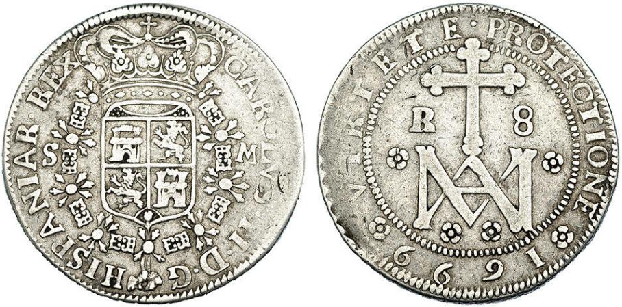 Lote  603  8 reales. 1699. Sevilla. M. Tipo «María». Leve acuñación floja en parte de las leyendas. Inédita. MBC-. Rarísima. Real de a Ocho del tipo MARIA (plata nueva), Sevilla, 1699 (Manuel Manso) (21,64 gramos). Con Variante de leyenda en reverso: VIRTETE. Pieza única e inédita, el primer Real de a Ocho conocido de factura mecanizada realizado en la ceca de Sevilla. En 1686 hubo en Castilla una gran reforma de la plata, donde sin cambiar la ley de la misma (11 dineros y 4 granos), se decidió que habría una llamada plata nueva acuñada en la Península con nuevos tipos (las Marías) con talla de 84 reales en marco (se reduce por tanto el peso del nuevo Real de a Ocho a unos 21,90 gramos) y con un valor de cambio de 12 reales vellón; mientras en las Indias se mantendría la llamada plata vieja, con una talla de 67 reales por marco (por tanto sin cambiar el peso antiguo de las monedas), y cuyo Real de a Ocho, ahora llamado también Escudo de Plata de 10 reales (de plata nueva) o Peso Escudo de plata, tendría un valor de cambio de 15 reales de vellón. Esta reforma sólo se aplicó a medias, y en las casas de moneda de la Península se siguió acuñando plata vieja junto a la plata nueva, pero se pusieron las bases para diferenciar claramente dos especies de plata, lo que triunfaría con los Borbones. La nueva moneda de plata cambió radicalmente su diseño, desaparece el tradicional gran escudo de la Monarquía y es sustituido por el cuartelado de Castilla y León, que por primera vez en una moneda de plata, sólo en el Real de a Ocho, aparece rodeado del collar del Toisón de oro, mientras el reverso tiene una clara invocación mariana, colocando el monograma de la Virgen bajo la Cruz, buscando la protección de la divinidad y mostrando el apoyo de la Corona a las propuestas de proclamación del Dogma de la Inmaculada Concepción.