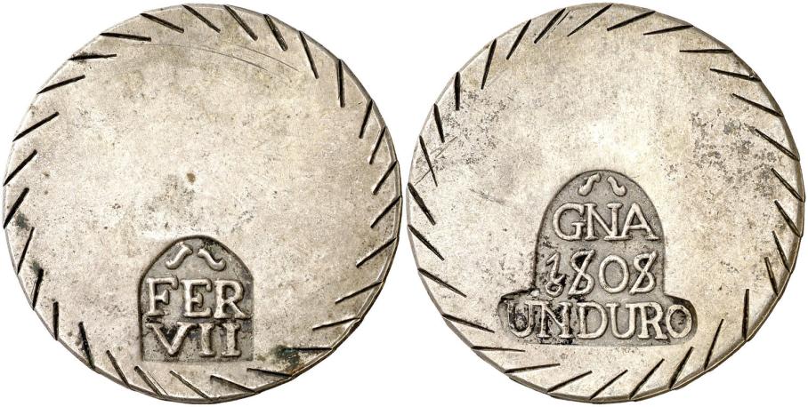 Lot 1526  1808. Fernando VII. Girona. 1 duro. (Cal. 428). 25,60 g. Falsa de época en metal blanco. EBC.  Estimate: 100 EUR  Starting Price: 60 EUR  Lot unsold