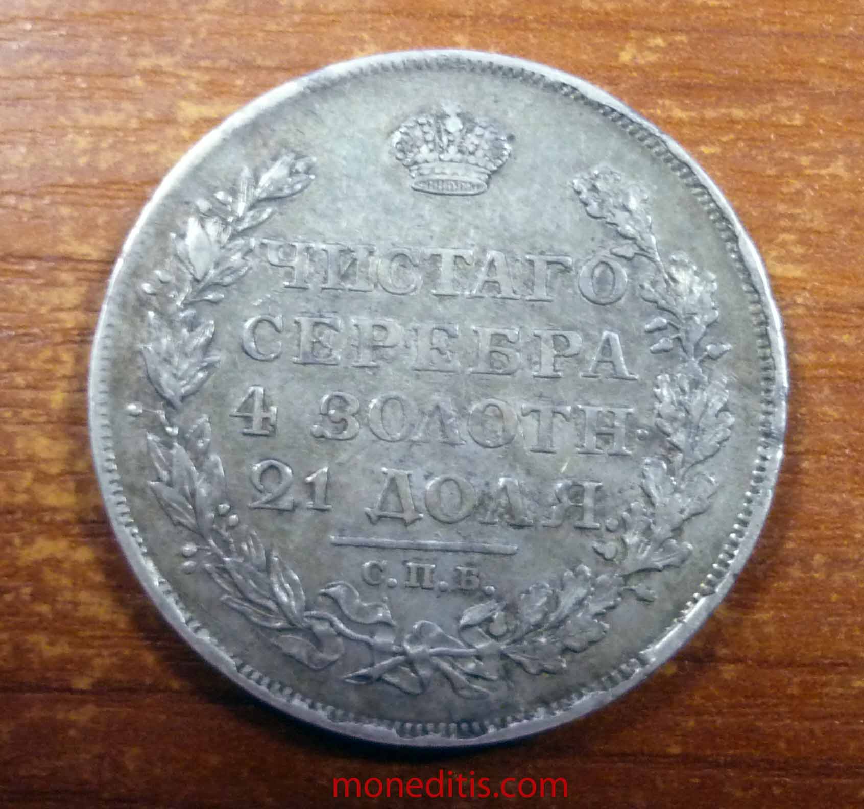 Реверс: вдоль края монеты зубчатый ободок, в середине вверху императорская корона, под ней надпись «ЧИСТОГО», ниже слово «СЕРЕБРА», под ним «4 ЗОЛОТН.» (4 золотника), ниже «21 ДОЛЯ.». Слева вдоль края лавровая ветвь, справа дубовая, внизу ветви соединяются и перевязаны лентой, над ней обозначение Санкт-Петербургского монетного двора «С.П.Б.», выше него прямая черта.