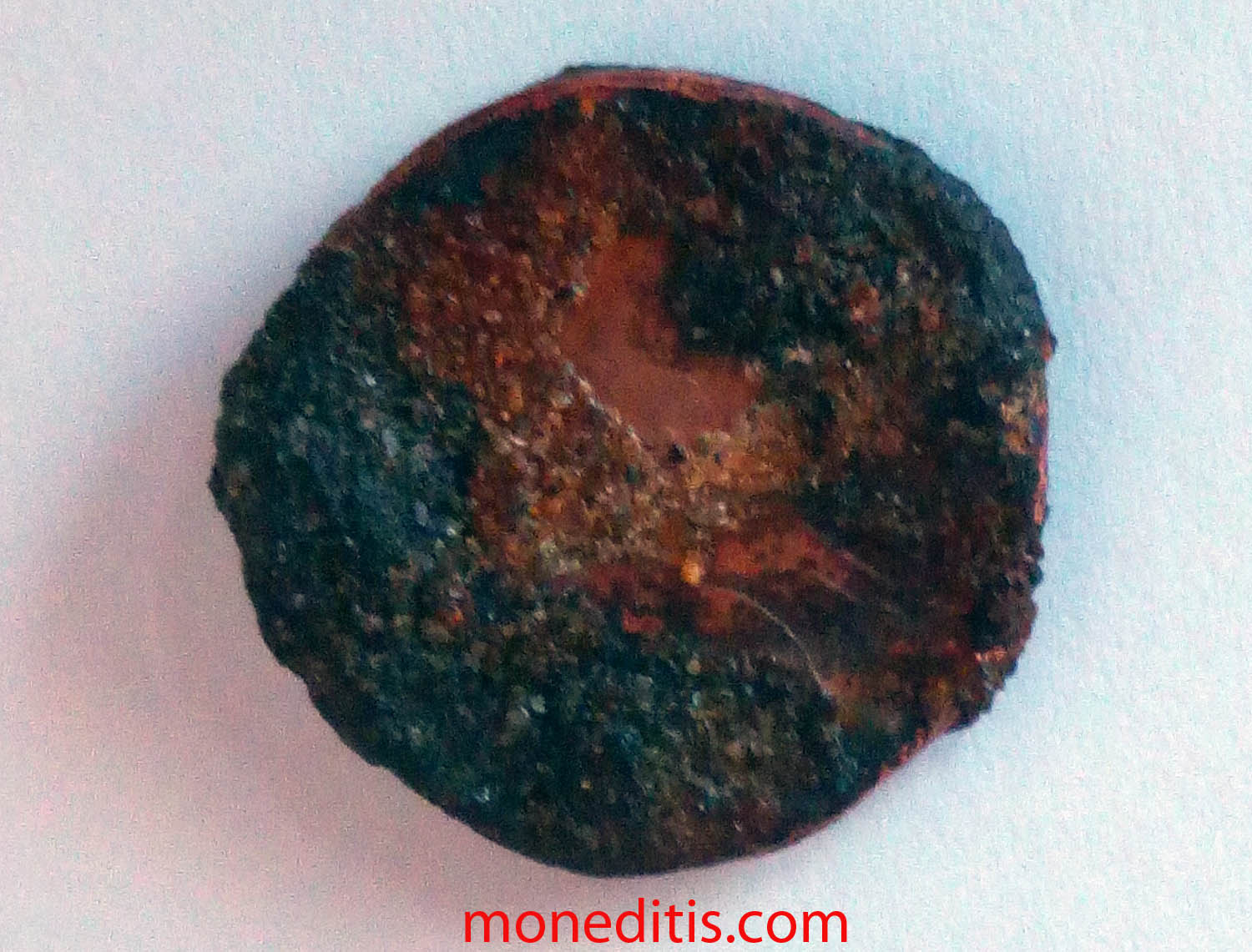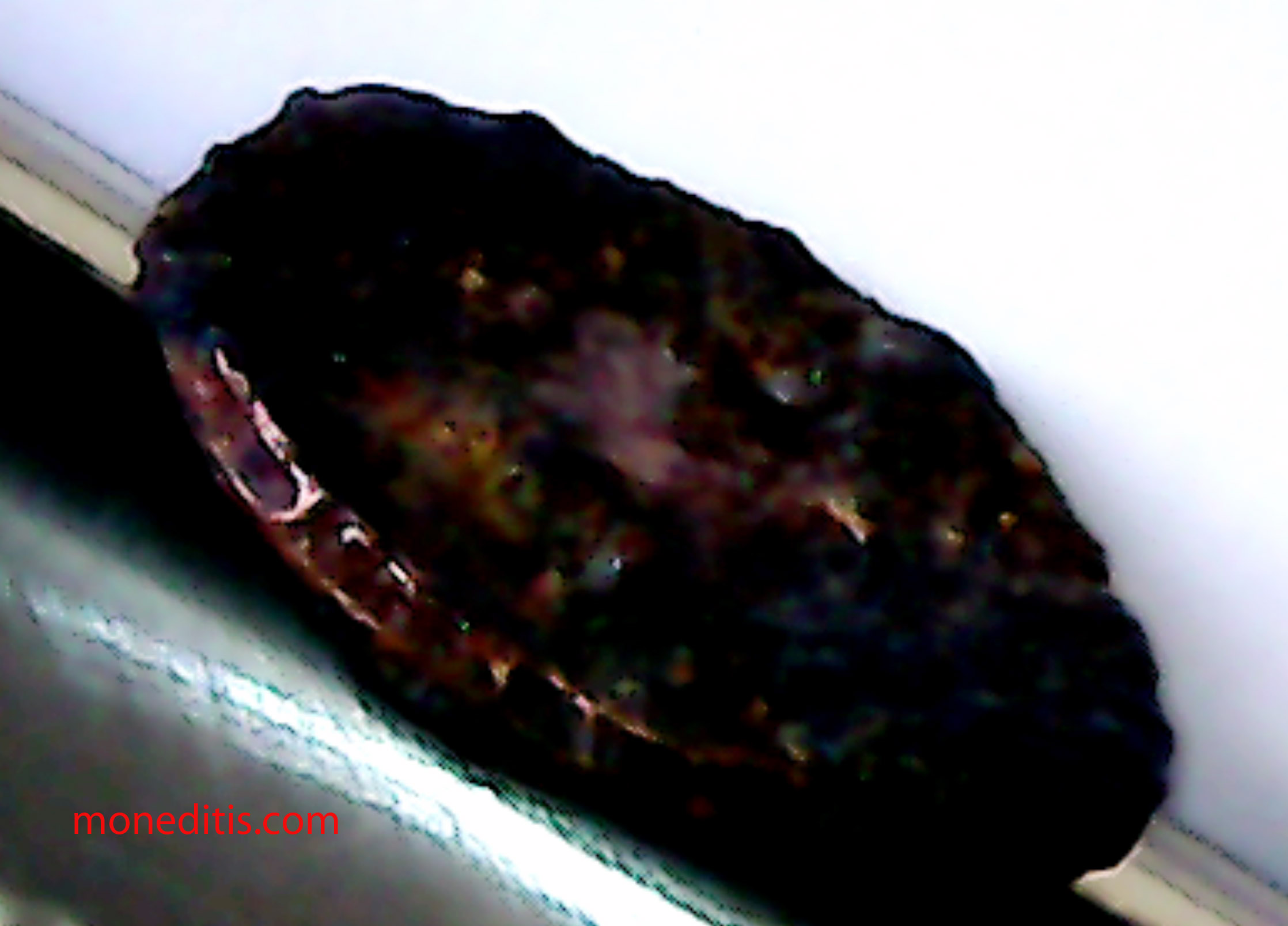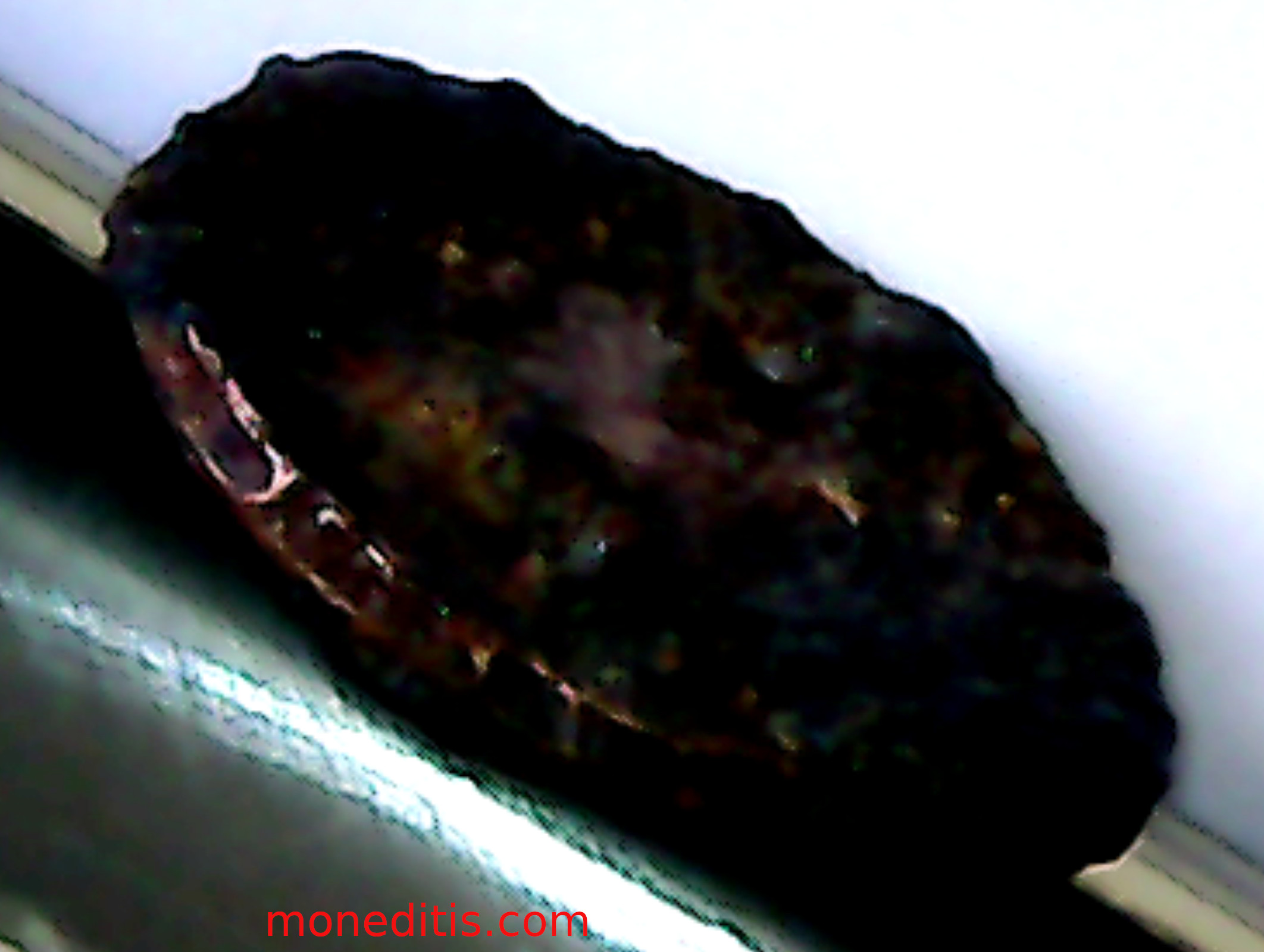 Al microscopio con pocos aumentos, para no desvirtuar en exceso el conjunto, el canto no es el de una moneda de 5 céntimos, aunque parece confirmarse el cobre como metal de base/constitutivo. Imposible (sin otro tipo de análisis) determinar cuanto tiempo ha estado bajo el agua