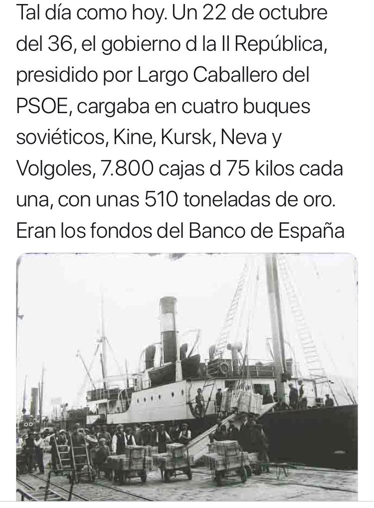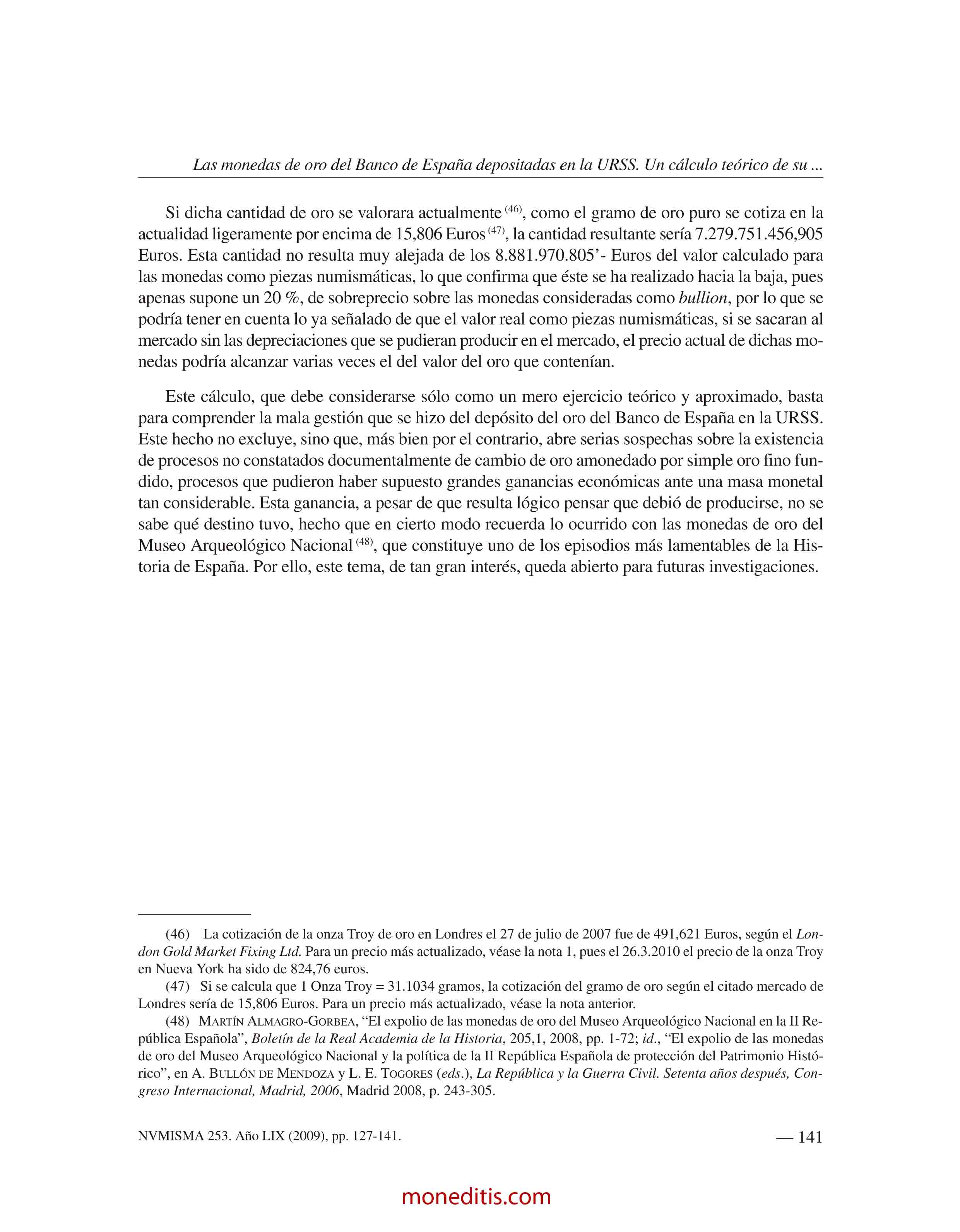 Ha llegado a mis manos un artículo de Martín Almagro-Gorbea en el número 253 de la revista Numisma, en el que se detallan las monedas contenidas en las 510 toneladas del oro depositado en las cámaras del Banco Central de la URSS a principios de noviembre de 1936