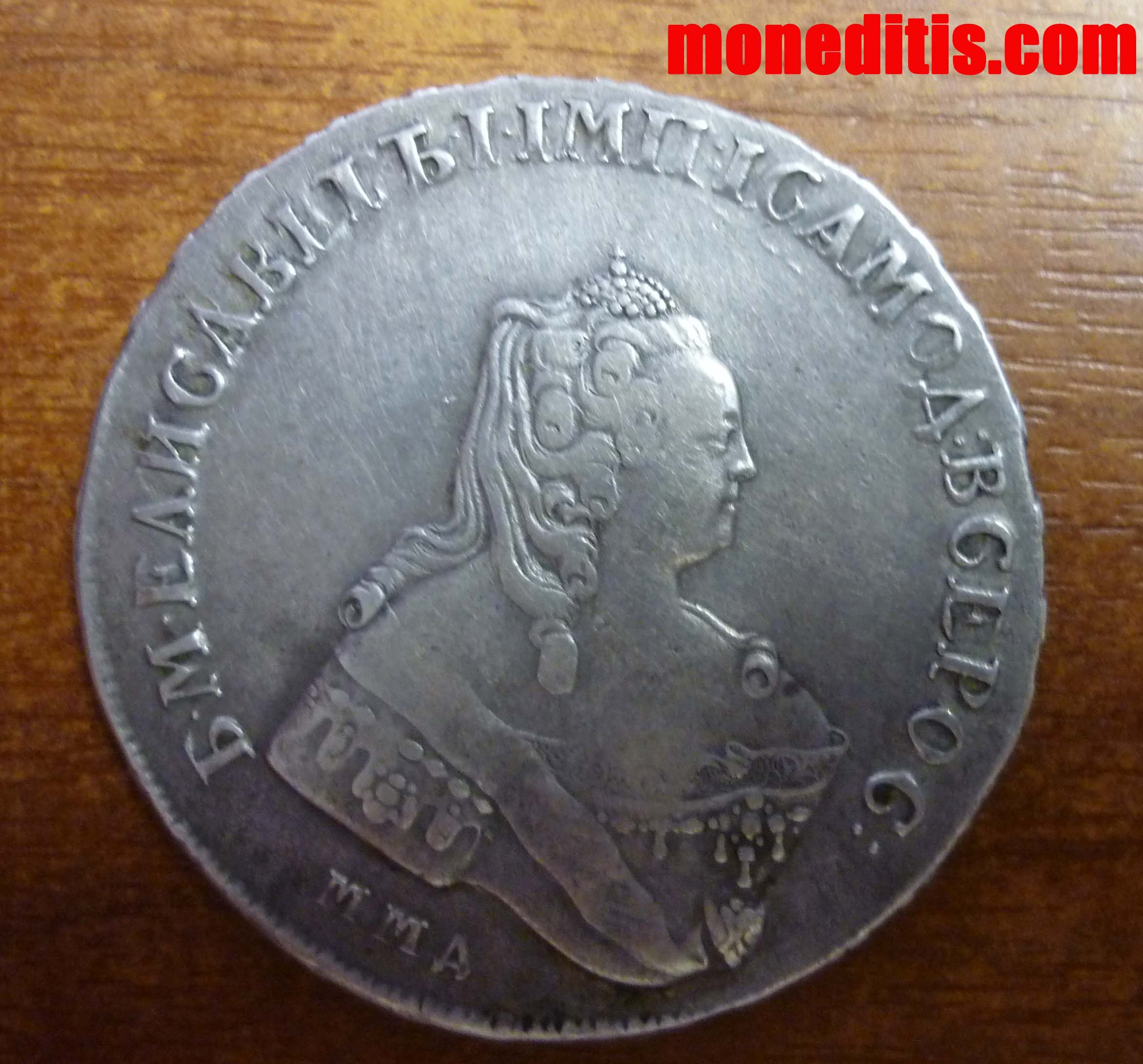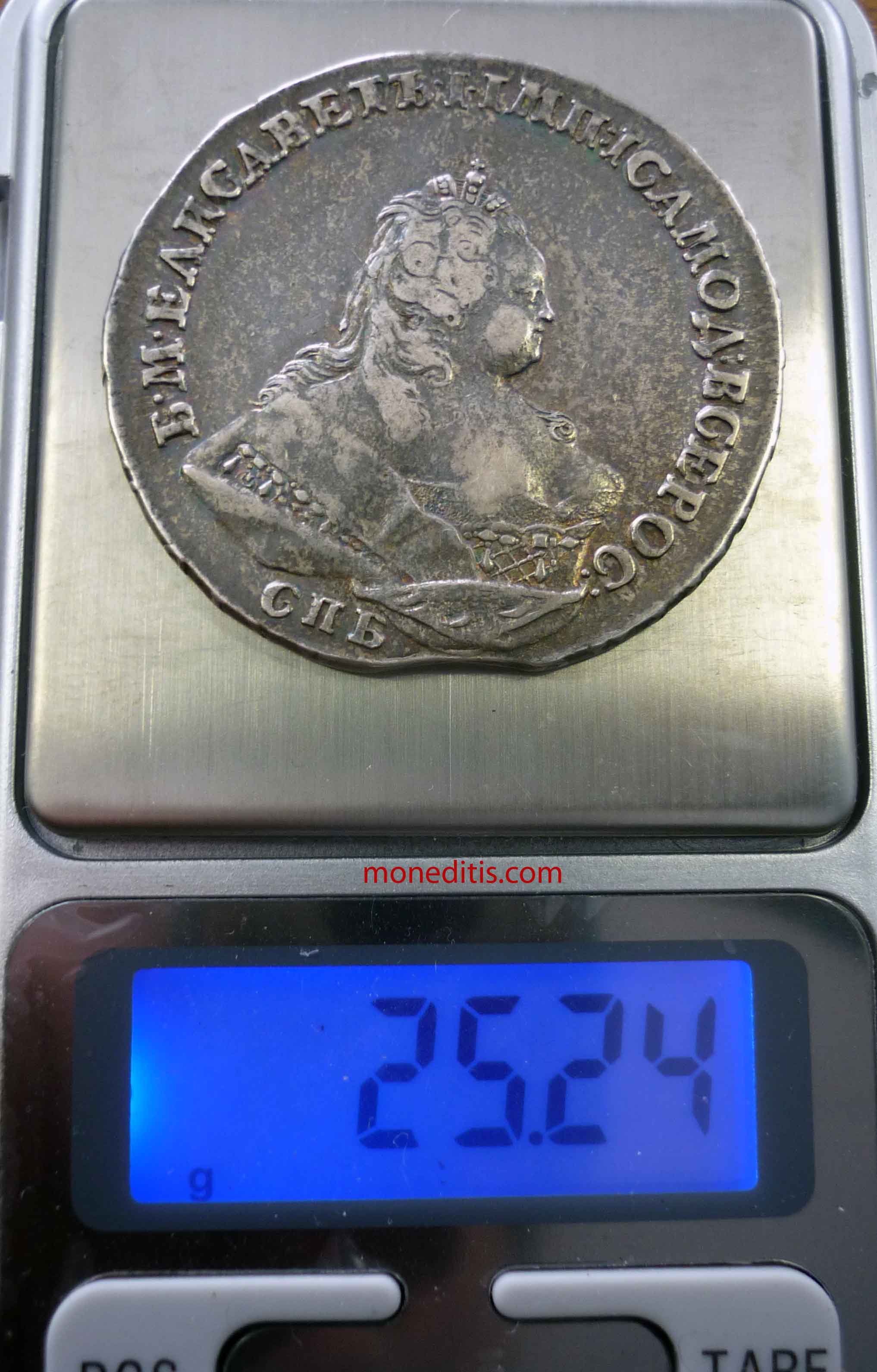 El anverso es un retrato de la emperatriz y la inscripción «B M Elisabet I IMP I SAMODOD», el Reverso es un águila de dos cabezas y la inscripción «moneda Rublo» y la fecha. Ley-802, peso estándar-25,85 gramos. canto-inscripción «S. peterburhskago casa de la moneda»
