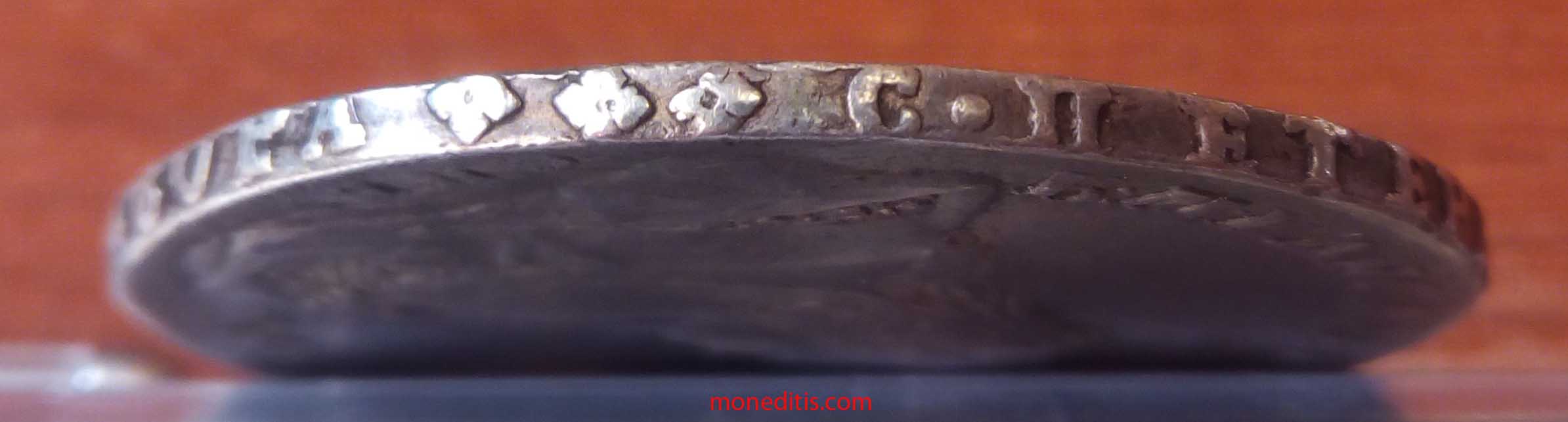 Гурт данной монеты, согласно международному каталогу, имеет №6, то есть шнуровидный с наклоном влево. Такие десять золотых рублей производились в период с 1755 года по 1759 год.