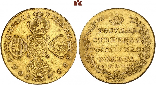 Александр I. 1801-1825. 10 Рублей 1802 года, Санкт-Петербург. 12.17 г. Четыре коронованных герба помещены в крест, в центре щит с орлом //Четыре строки шрифта, внизу указатель монетного двора, вверху корона, по бокам лавровая и дубовая ветви. Биткин 2 (Р1); Фб. 146; Шл. 7.1.