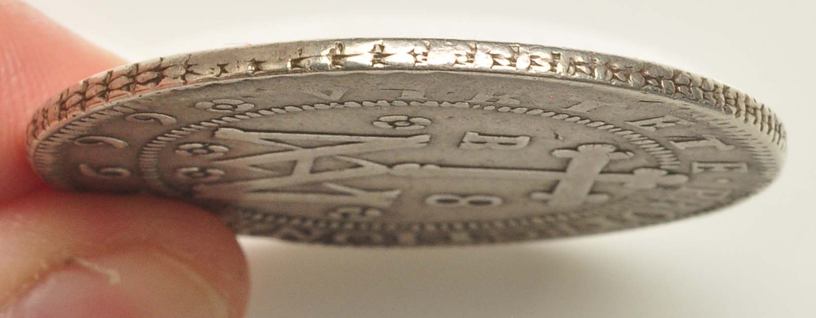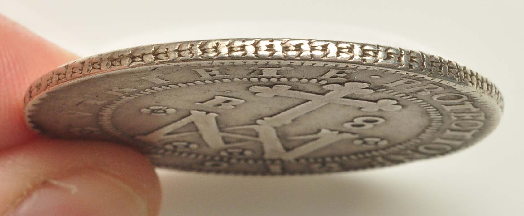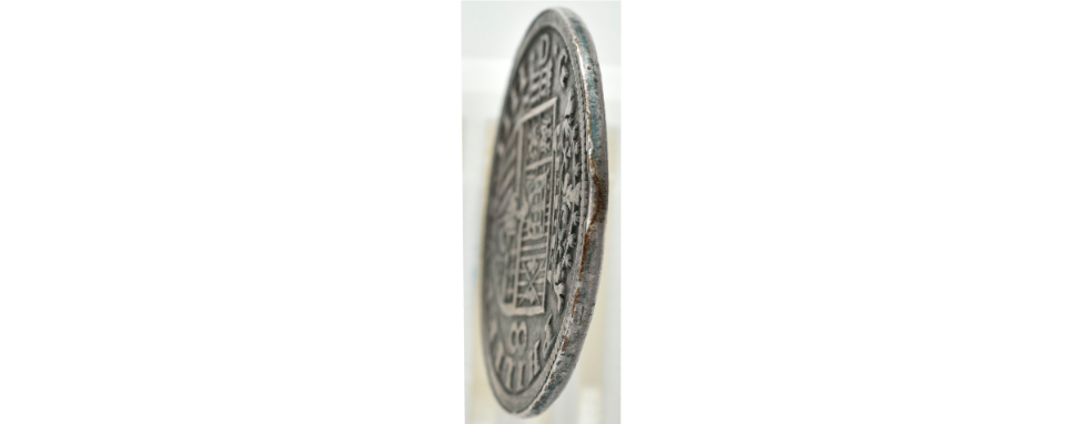 Pues bien, esta moneda demuestra que, al menos en pruebas, la nueva maquinaria de acuñación a volante ya funcionaba en 1699 y se usaba en las principales piezas de referencia. Los Reales de a Ocho de esta fecha que se conocían hasta ahora de la ceca de Sevilla eran todos realizados a martillo y con fecha corregida sobre 1698, lo que no ocurre en nuestro caso, como demuestran los análisis metalográficos realizados en el SiDI de la Universidad Autónoma de Madrid. De este año 1699 son las primeras Onzas sevillanas realizadas de forma mecánica, lo cual avala también la producción de los Reales de a Ocho por el mismo método, como es la pieza que presentamos.