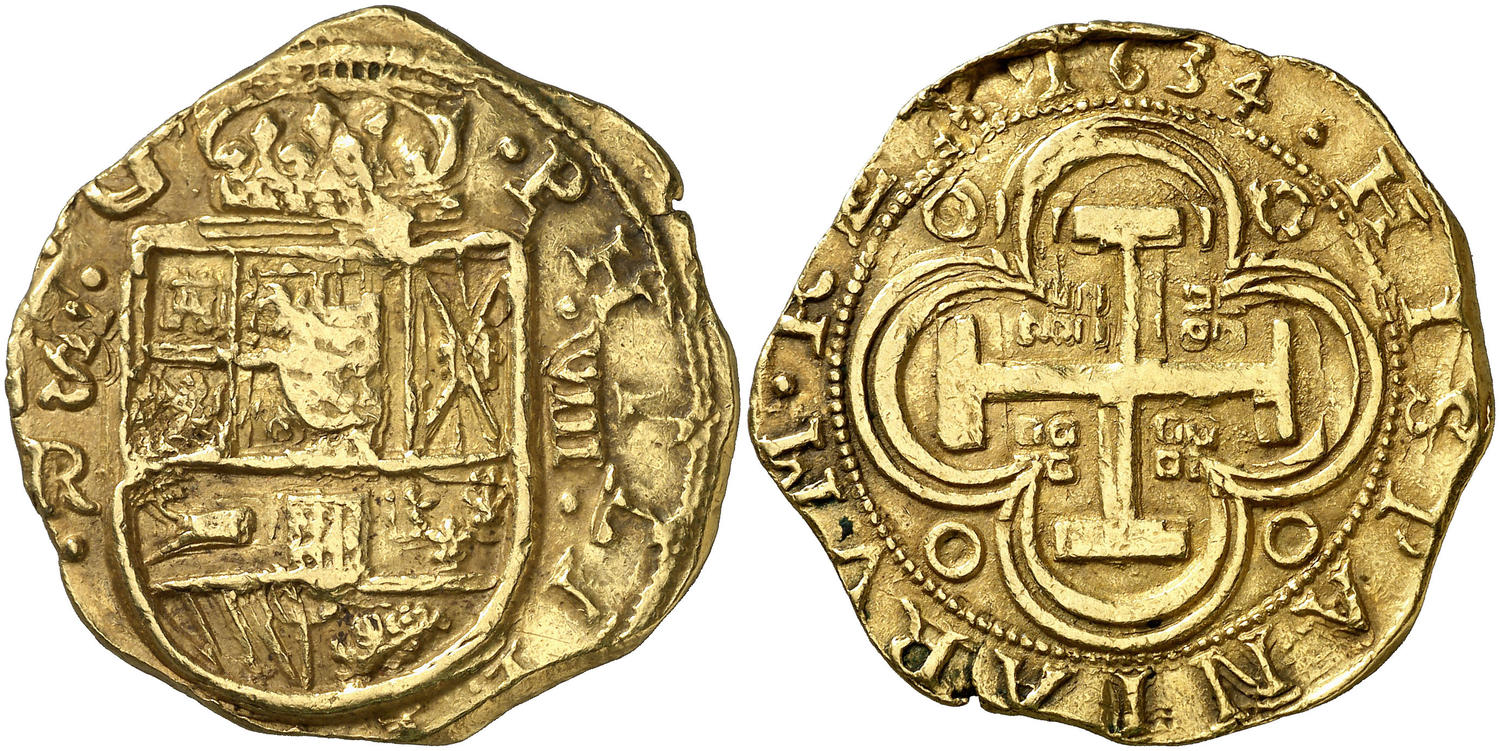 Lot 398 1634. Felipe IV. Sevilla. R. 8 escudos. (Cal. 51, mismo ejemplar) (Cal.Onza 63, mismo ejemplar) (Tauler 63). 26,96 g. Ensayador bajo la ceca. Orla de puntos interior sólo en reverso. Cuadraditos en los ángulos de la cruz. Bella. Ex Colección Isabel de Trastámara 25/05/2017, nº 813. Extraordinariamente rara. Sólo se conocen cuatro ejemplares. EBC-.