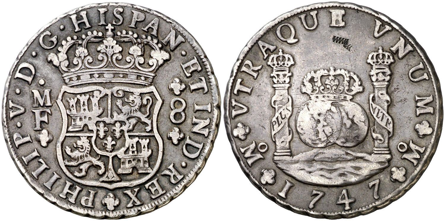 Lot 428 1747. Felipe V. México. MF. 8 reales. (Cal. 501). 26,69 g. Columnario. Raspadura. Rara. MBC-. Estimate: 450 EUR Starting Price: 350 EUR Lot unsold