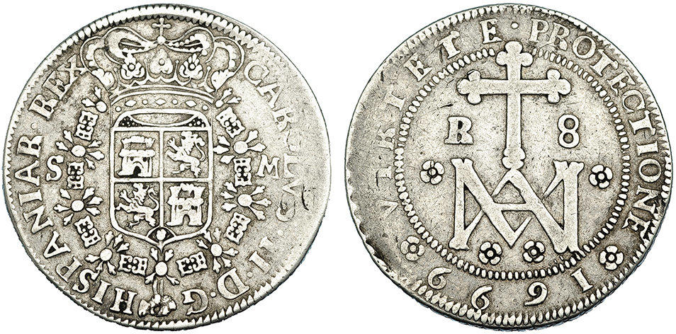 Lote 603 8 reales. 1699. Sevilla. M. Tipo «María». Leve acuñación floja en parte de las leyendas. Inédita. MBC-. Rarísima. Real de a Ocho del tipo MARIA (plata nueva), Sevilla, 1699 (Manuel Manso) (21,64 gramos). Con Variante de leyenda en reverso: VIRTETE. Pieza única e inédita, el primer Real de a Ocho conocido de factura mecanizada realizado en la ceca de Sevilla. En 1686 hubo en Castilla una gran reforma de la plata, donde sin cambiar la ley de la misma (11 dineros y 4 granos), se decidió que habría una llamada plata nueva acuñada en la Península con nuevos tipos (las Marías) con talla de 84 reales en marco (se reduce por tanto el peso del nuevo Real de a Ocho a unos 21,90 gramos) y con un valor de cambio de 12 reales vellón; mientras en las Indias se mantendría la llamada plata vieja, con una talla de 67 reales por marco (por tanto sin cambiar el peso antiguo de las monedas), y cuyo Real de a Ocho, ahora llamado también Escudo de Plata de 10 reales (de plata nueva) o Peso Escudo de plata, tendría un valor de cambio de 15 reales de vellón. Esta reforma sólo se aplicó a medias, y en las casas de moneda de la Península se siguió acuñando plata vieja junto a la plata nueva, pero se pusieron las bases para diferenciar claramente dos especies de plata, lo que triunfaría con los Borbones. La nueva moneda de plata cambió radicalmente su diseño, desaparece el tradicional gran escudo de la Monarquía y es sustituido por el cuartelado de Castilla y León, que por primera vez en una moneda de plata, sólo en el Real de a Ocho, aparece rodeado del collar del Toisón de oro, mientras el reverso tiene una clara invocación mariana, colocando el monograma de la Virgen bajo la Cruz, buscando la protección de la divinidad y mostrando el apoyo de la Corona a las propuestas de proclamación del Dogma de la Inmaculada Concepción.