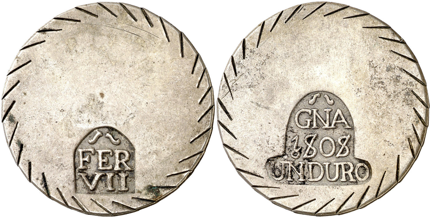 Lot 1526 1808. Fernando VII. Girona. 1 duro. (Cal. 428). 25,60 g. Falsa de época en metal blanco. EBC. Estimate: 100 EUR Starting Price: 60 EUR Lot unsold