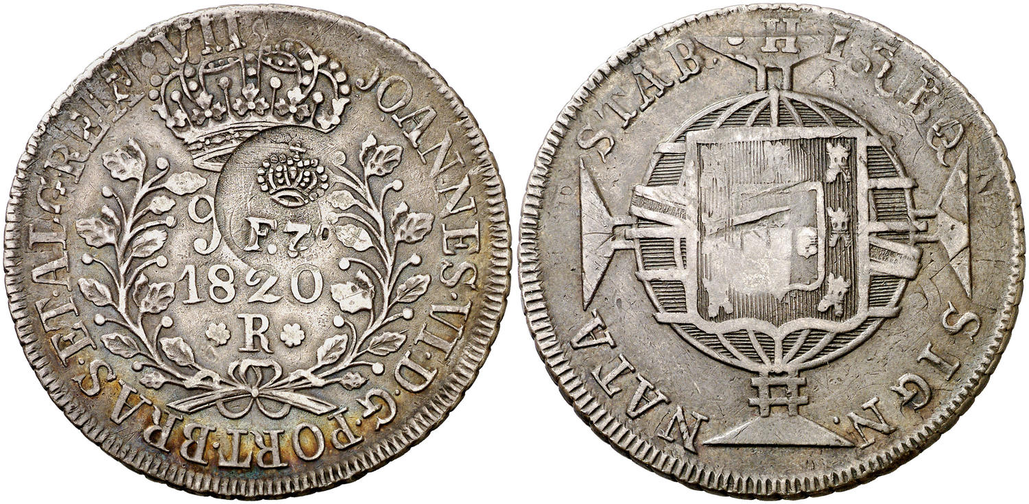 Lot 1531 Resello (falso) F7º bajo corona, en anverso, bajo corona sobre 960 reis de Brasil, R (Río) de 1820 acuñada a su vez sobre 8 reales españoles de Fernando VII. (Kr. 53, indica «rare» sin precio). 26,62 g. Ex Áureo 28/05/2003, nº 688. MBC. Estimate: 500 EUR Starting Price: 300 EUR Lot unsold