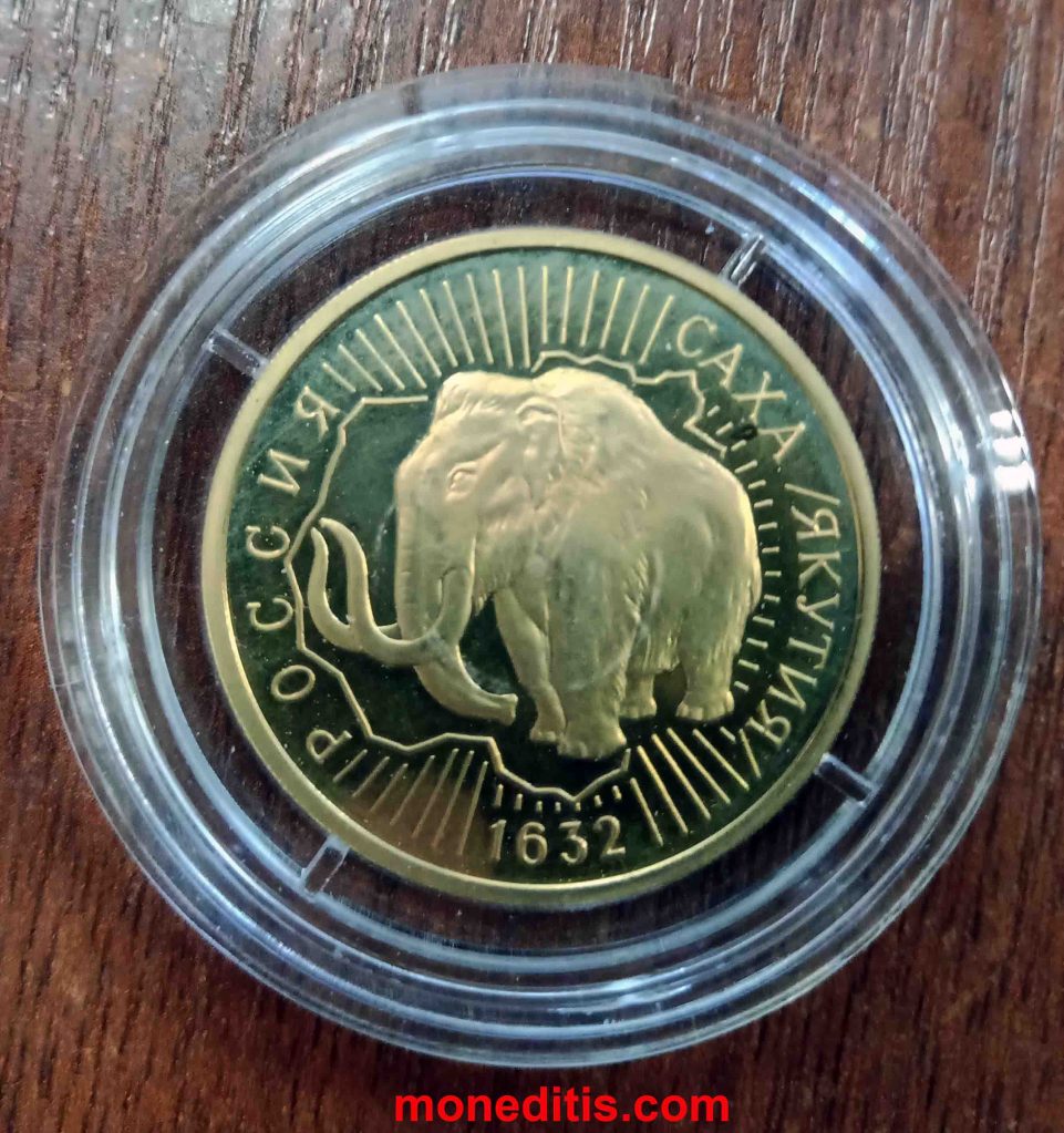 Moneda de oro .900 de ½ onza del año 1992 conmemorando los 360 años de Sajá-Yakutia (región) en Rusia, con mamut y fecha (1632) en reverso y hecho en la Casa de la Moneda de Moscú