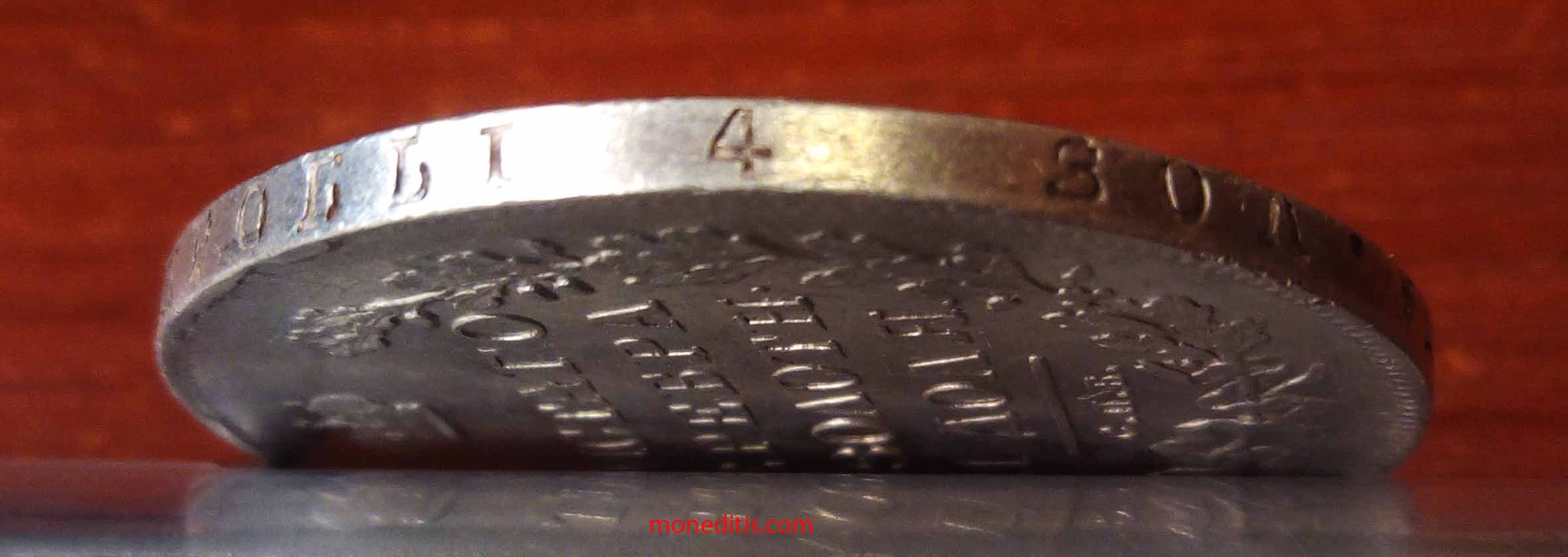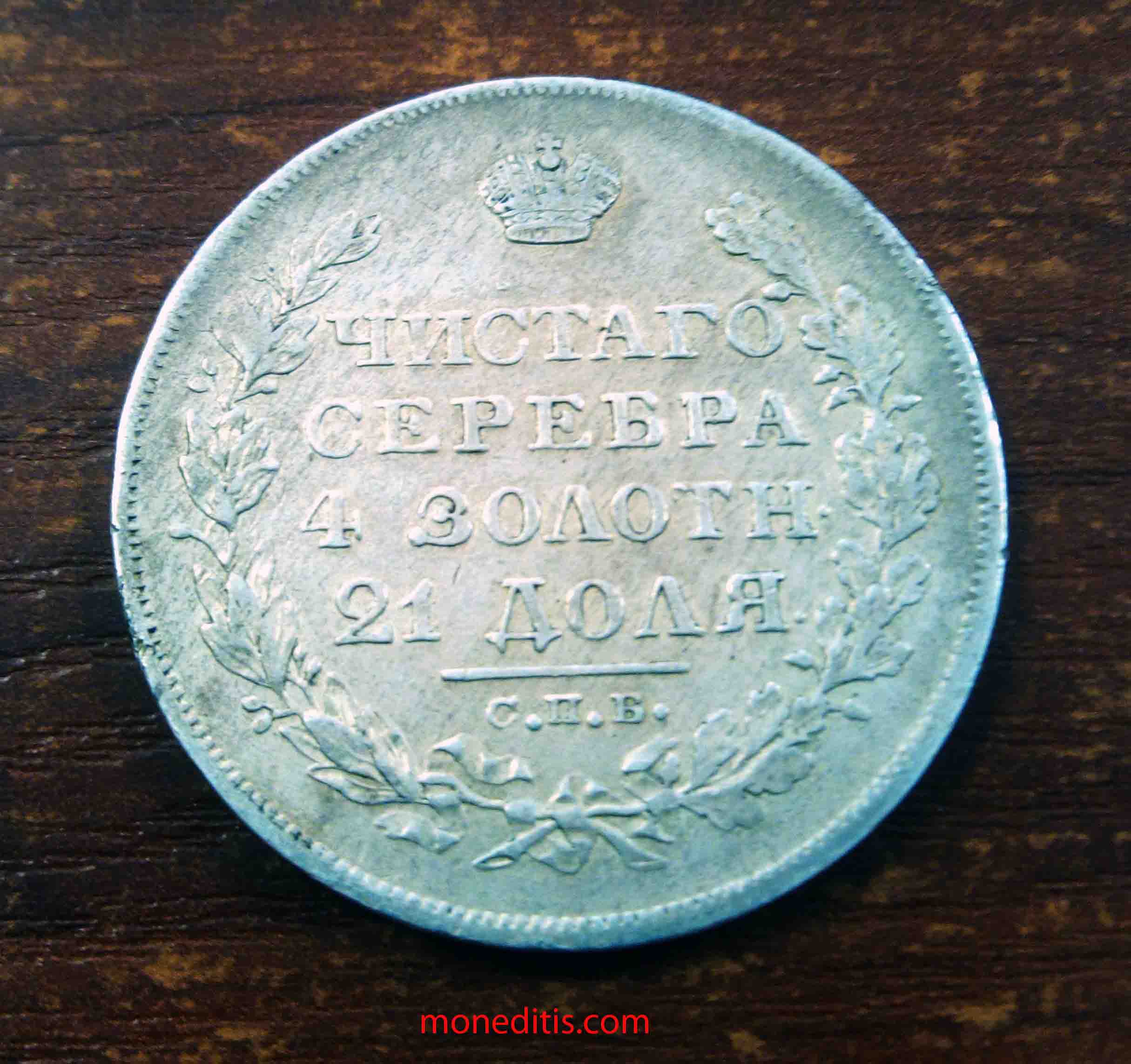 Реверс: вдоль края монеты зубчатый ободок, в середине вверху императорская корона, под ней надпись «ЧИСТОГО», ниже слово «СЕРЕБРА», под ним «4 ЗОЛОТН.» (4 золотника), ниже «21 ДОЛЯ.». Слева вдоль края лавровая ветвь, справа дубовая, внизу ветви соединяются и перевязаны лентой, над ней обозначение Санкт-Петербургского монетного двора «С.П.Б.», выше него прямая черта.