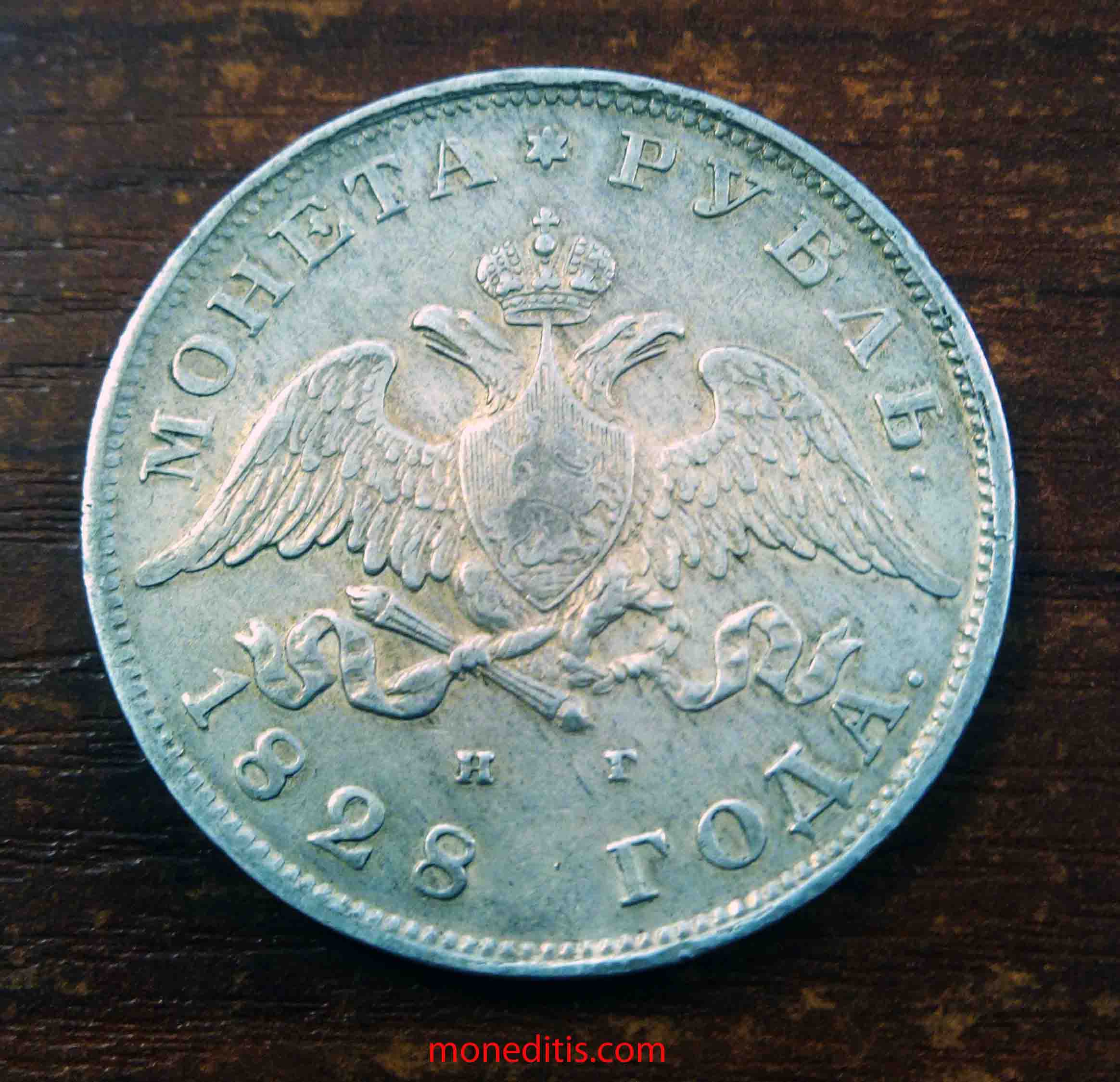 Аверс: по краю монеты ободок из точек, в центре двуглавый орел с крыльями, опущенными вниз, над головами императорская корона, на груди орла Московский герб с Георгием Победоносцем, поражающим дракона копьем, на коне повернутом вправо. Слева в когтях орла перевитый лентами факел, горящий с обеих сторон, и часть ленты, справа в когтях – лавровый венок и вторая часть ленты, ниже под левой лапой инициал минцмейстера «Н», под правой «Г» (Николай Грачев), под ними год выпуска монеты «1828 ГОДА.». Слева сверху над орлом надпись по краю «МОНЕТА», справа вдоль края обозначение достоинства «РУБЛЬ.», между ними шестиконечная звезда.