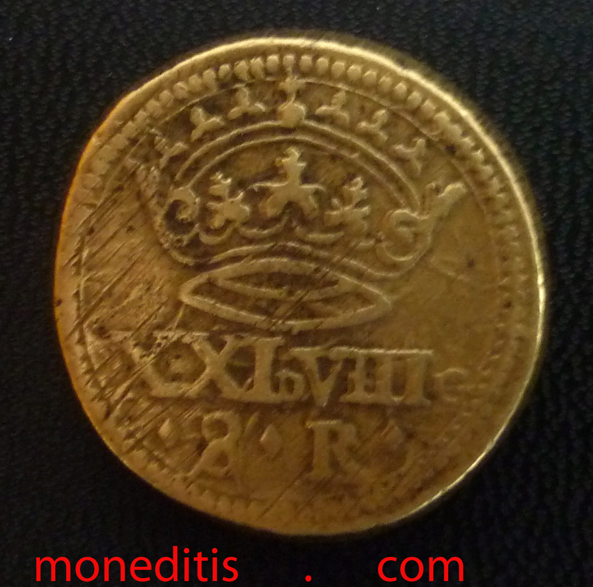En este caso, se trata de 8 reales macuquinos de Carlos II acuñados en Potosí o Lima en 168() o sin fecha, dependiendo del vendedor, Aureo o Numismática Carlos Peláez en ebay, respectivamente. Estos últimos alertan de la falsedad de la pieza, afirmando que, al menos, es de plata.