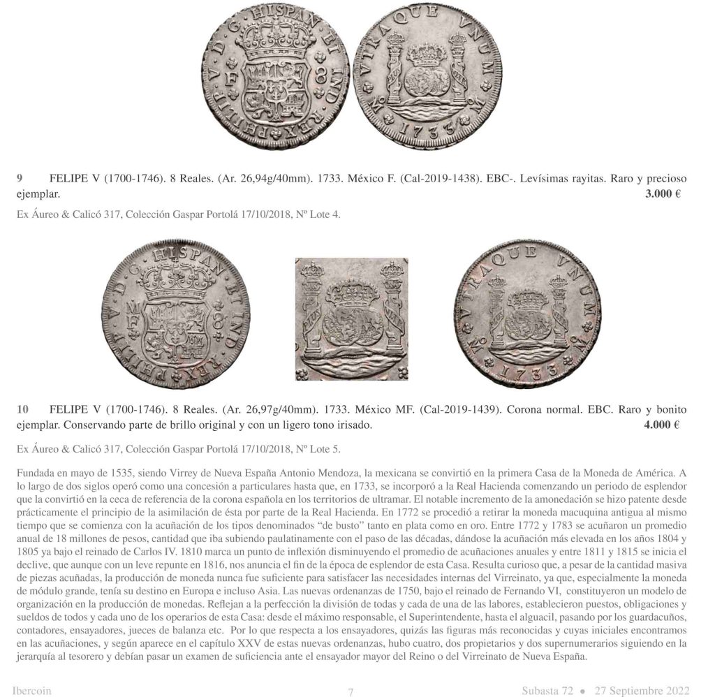 Será a partir de 1728, con el decreto de modernización de la moneda española, cuando el proceso de fabricación de la moneda de plata se mecanice y perfeccione, disminuyéndose en gran medida las posibilidades de falsificaciones y alteraciones de las piezas30. Entre los nuevos tipos que los Borbones crearon en América, a partir de Felipe V, para diferenciar las piezas acuñadas en el Nuevo Mundo de las de la Península, destacan precisamente los del real de a ocho, moneda llamada «columnaria de mundos y mares» por los dos hemisferios coronados, entre las columnas de Hércules y sobre el océano, representados en sus reversos31