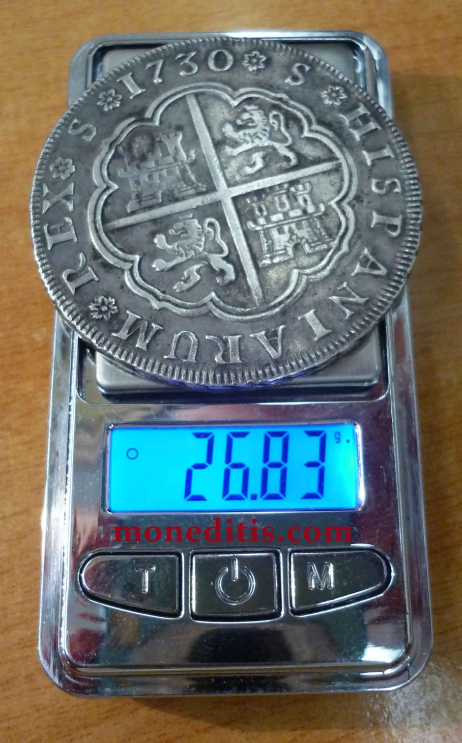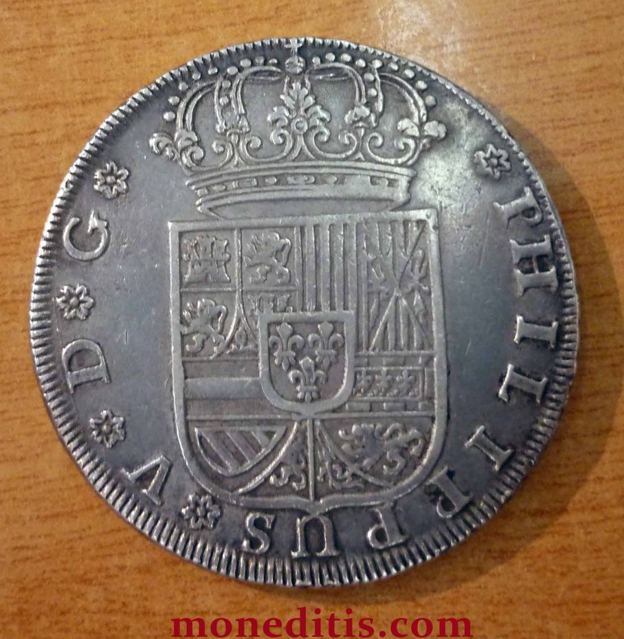 Sin valor ni ensayador. Además de Sevilla,  en 1730 se acuñaron 8 reales en Madrid (peninsulares) y Lima, Méjico y Potosí – macuquinas de Ultramar