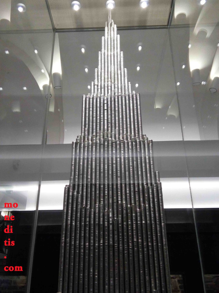 Además, como curiosidad, tiene una estructura construida con monedas de 1 rublo de 3,2 m de altura y 3 toneladas de peso (ambas fotos superiores – figura frente a caja de caudales central-pilar)